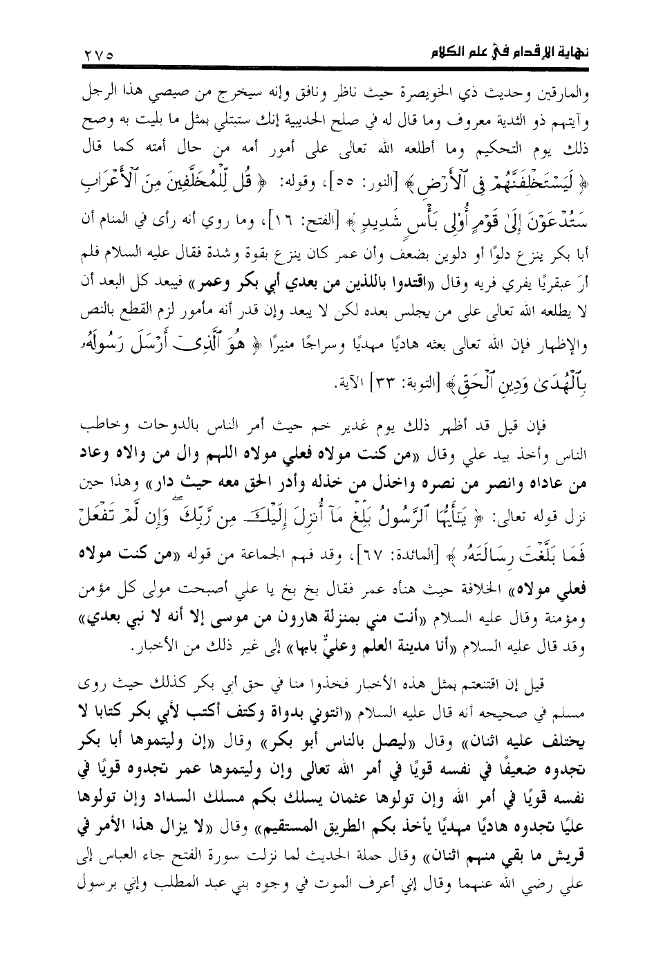 والمارقين وحديث ذي الخويصرة حيث ناظر ونافق وإنه سيخرج من صيصي هذا الرجل وآيتهم ذو الثدية معروف وما قال له في صلح الحديبية إنك ستبتلى بمثل ما بليت به وصح ذلك يوم التحكيم وما أطلعه اللّه تعالى على أمور أمه من حال أمته كما قال لَيَسْتَخْلِفَنَّهُمْ فِي الْأَرْضِ [النور: 55]، وقوله: قُلْ لِلْمُخَلَّفِينَ مِنَ الْأَعْرابِ سَتُدْعَوْنَ إِلى قَوْمٍ أُولِي بَأْسٍ شَدِيدٍ [الفتح: 16]، وما روي أنه رأى في المنام أن أبا بكر ينزع دلوا أو دلوين بضعف وأن عمر كان ينزع بقوة وشدة فقال عليه السلام فلم أر عبقريا يفري فريه وقال «اقتدوا باللذين من بعدي أبي بكر وعمر» فيبعد كل البعد أن لا يطلعه اللّه تعالى على من يجلس بعده لكن لا يبعد وإن قدر أنه مأمور لزم القطع بالنص والإظهار فإن اللّه تعالى بعثه هاديا مهديا وسراجا منيرا هُوَ الَّذِي أَرْسَلَ رَسُولَهُ بِالْهُدى وَ دِينِ الْحَقِّ [التوبة: 33] الآية.