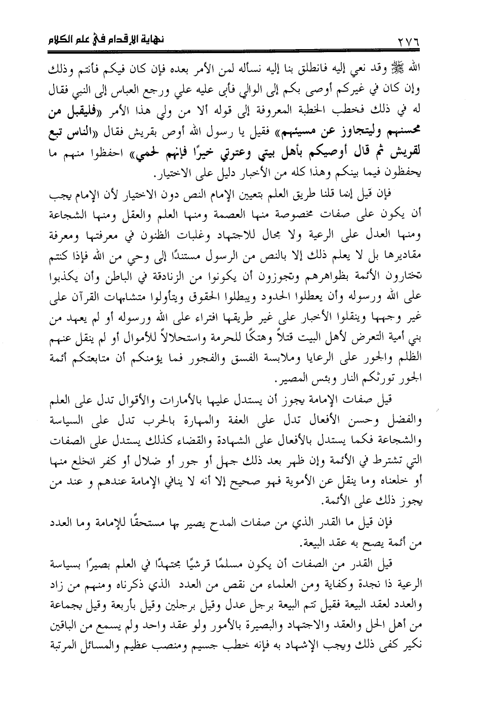 قيل القدر من الصفات أن يكون مسلما قرشيا مجتهدا في العلم بصيرا بسياسة الرعية ذا نجدة وكفاية ومن العلماء من نقص من العدد الذي ذكرناه ومنهم من زاد والعدد لعقد البيعة فقيل تتم البيعة برجل عدل وقيل برجلين وقيل بأربعة وقيل بجماعة من أهل الحل والعقد والاجتهاد والبصيرة بالأمور ولو عقد واحد ولم يسمع من الباقين نكير كفى ذلك ويجب الإشهاد به فإنه خطب جسيم ومنصب عظيم والمسائل المرتبة