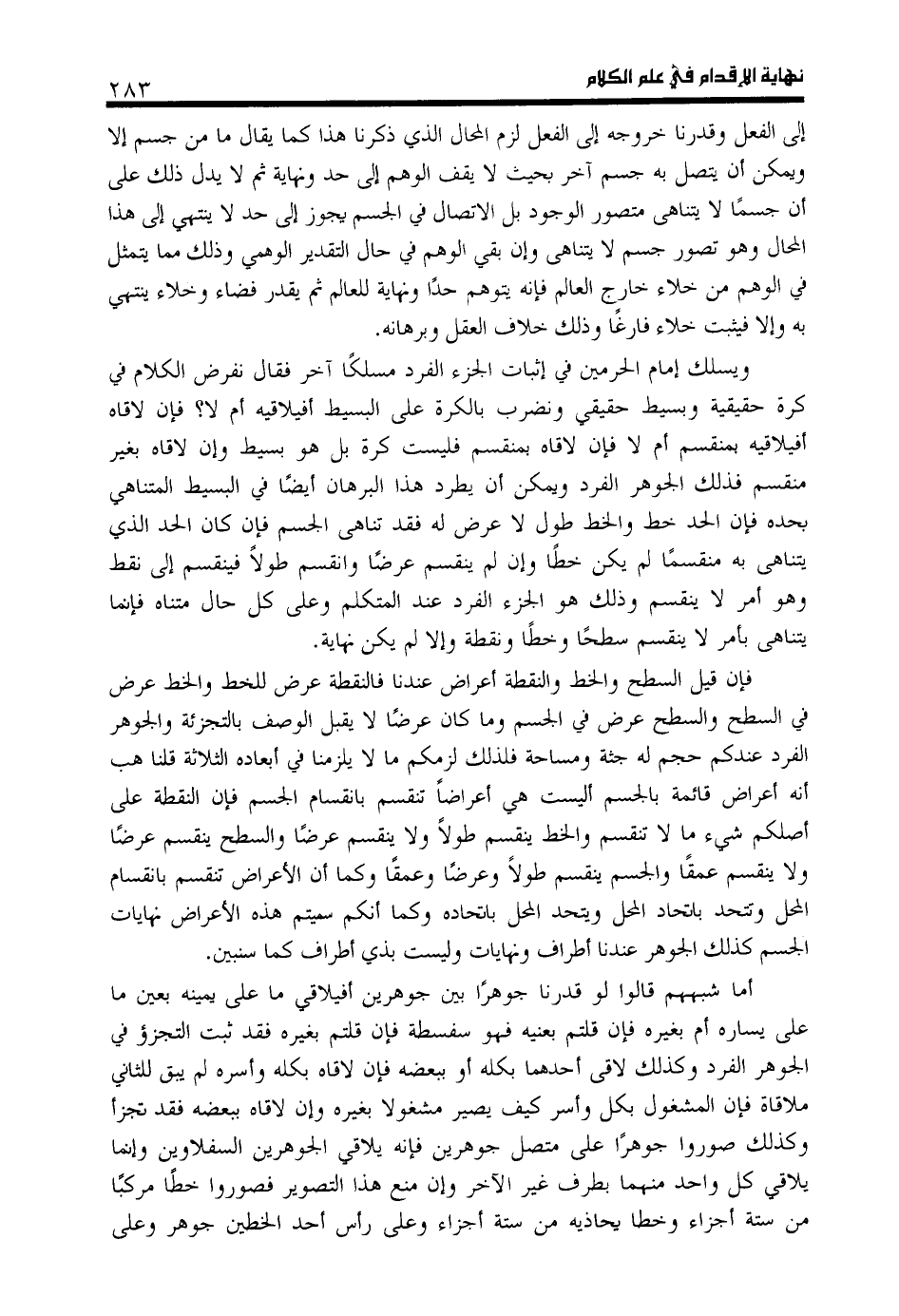 ويسلك إمام الحرمين في إثبات الجزء الفرد مسلكا آخر فقال نفرض الكلام في كرة حقيقية وبسيط حقيقي ونضرب بالكرة على البسيط أ فيلاقيه أم لا؟ فإن لاقاه أ فيلاقيه بمنقسم أم لا فإن لاقاه بمنقسم فليست كرة بل هو بسيط وإن لاقاه بغير منقسم فذلك الجوهر الفرد ويمكن أن يطرد هذا البرهان أيضا في البسيط المتناهي بحده فإن الحد خط والخط طول لا عرض له فقد تناهى الجسم فإن كان الحد الذي يتناهى به منقسما لم يكن خطا وأن لم ينقسم عرضا وانقسم طولا فينقسم إلى نقط وهو أمر لا ينقسم وذلك هو الجزء الفرد عند المتكلم وعلى كل حال متناه فإنما يتناهى بأمر لا ينقسم سطحا وخطا ونقطة وإلا لم يكن نهاية.