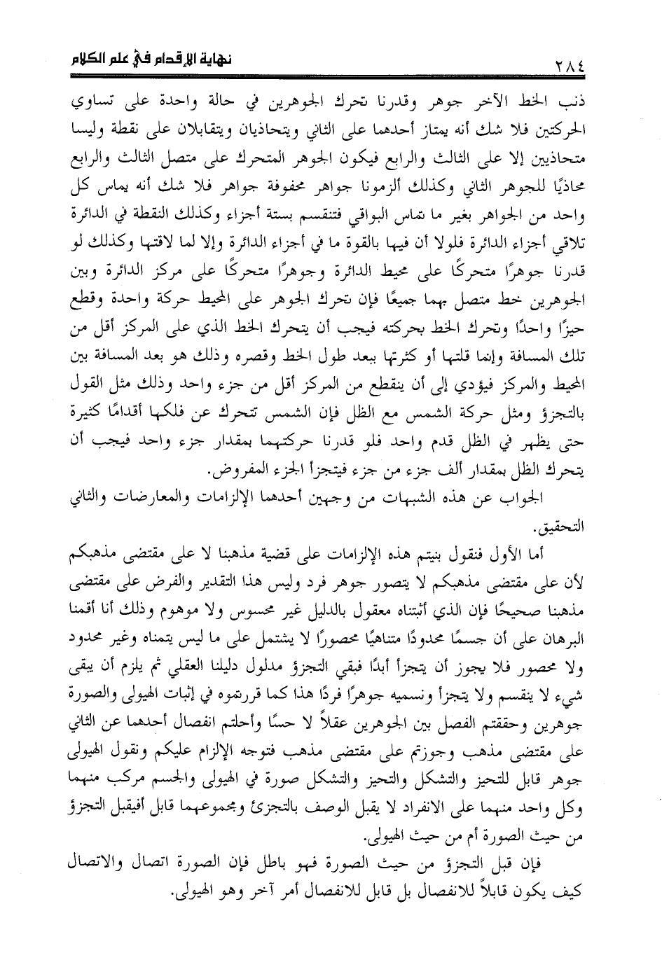 ذنب الخط الآخر جوهر وقدرنا تحرك الجوهرين في حالة واحدة على تساوي الحركتين فلا شك أنه يمتاز أحدهما على الثاني ويتحاذيان ويتقابلان على نقطة وليسا متحاذيين إلا على الثالث والرابع فيكون الجوهر المتحرك على متصل الثالث والرابع محاذيا للجوهر الثاني وكذلك ألزمونا جواهر محفوفة جواهر فلا شك أنه يماس كل واحد من الجواهر بغير ما تماس البواقي فتنقسم بستة أجزاء وكذلك النقطة في الدائرة تلاقي أجزاء الدائرة فلو لا أن فيها بالقوة ما في أجزاء الدائرة وإلا لما لاقتها وكذلك لو قدرنا جوهرا متحركا على محيط الدائرة وجوهرا متحركا على مركز الدائرة وبين الجوهرين خط متصل بهما جميعا فإن تحرك الجوهر على المحيط حركة واحدة وقطع حيزا واحدا وتحرك الخط بحركته فيجب أن يتحرك الخط الذي على المركز أقل من تلك المسافة وإنما قلتها أو كثرتها ببعد طول الخط وقصره وذلك هو بعد المسافة بين المحيط والمركز فيؤدي إلى أن ينقطع من المركز أقل من جزء واحد وذلك مثل القول بالتجزؤ ومثل حركة الشمس مع الظل فإن الشمس تتحرك عن فلكها أقداما كثيرة حتى يظهر في الظل قدم واحد فلو قدرنا حركتهما بمقدار جزء واحد فيجب أن يتحرك الظل بمقدار ألف جزء من جزء فيتجزأ الجزء المفروض.
