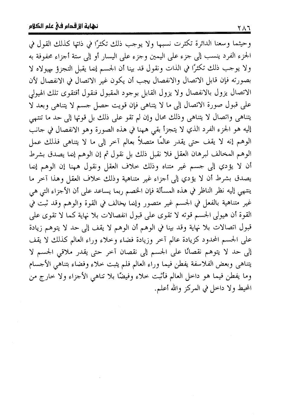 وحيثما وسعنا الدائرة تكثرت نسبها ولا يوجب ذلك تكثرا في ذاتها كذلك القول في الجزء الفرد ينسب إلى جزء على اليمين وجزء على اليسار أو إلى ستة أجزاء محفوفة به ولا يوجب ذلك تكثرا في الذات ونقول قد بينا أن الجسم إنما يقبل التجزؤ بهيولاه لا بصورته فإن قابل الاتصال والانفصال يجب أن يكون غير الاتصال في الانفصال لأن الاتصال يزول بالانفصال ولا يزول القابل بوجود المقبول فنقول أ فتقوى تلك الهيولي على قبول صورة الاتصال إلى ما لا يتناهى فإن قويت حصل جسم لا يتناهى وبعد لا يتناهى واتصال لا يتناهى وذلك محال وإن لم تقو على ذلك بل قوتها إلى حد ما تنتهي إليه هو الجزء الفرد الذي لا يتجزأ بقي هاهنا في هذه الصورة وهو الانفصال في جانب الوهم إنه لا يقف حتى يقدر عالما متصلا بعالم آخر إلى ما لا يتناهى فذلك عمل الوهم المخالف لبرهان العقل فلا نقبل ذلك بل نقول ثم إن الوهم إنما يصدق بشرط أن لا يؤدي إلى جسم غير متناه وذلك خلاف العقل ونقول هاهنا إن الوهم إنما يصدق بشرط أن لا يؤدي إلى أجزاء غير متناهية وذلك خلاف العقل وهذا آخر ما ينتهي إليه نظر الناظر في هذه المسألة فإن الخصم ربما يساعد على أن الأجزاء التي هي غير متناهية بالفعل في الجسم غير متصور وإنما يخالف في القوة والوهم وقد ثبت في القوة أن هيولى الجسم قوته لا تقوى على قبول انفصالات بلا نهاية كما لا تقوى على قبول اتصالات بلا نهاية وقد بينا في الوهم أن الوهم لا يقف إلى حد لا يتوهم زيادة على الجسم المحدود كزيادة عالم آخر وزيادة فضاء وخلاء وراء العالم كذلك لا يقف إلى حد لا يتوهم نقصانا على الجسم إلى نقصان آخر حتى يقدر ملاقي الجسم لا يتناهى وبعض الفلاسفة يفطن فيما وراء العالم فلم يثبت خلاء وفضاء بتناهي الأجسام وما يفطن فيما هو داخل العالم فأثبت خلاء وفيضا بلا تناهي الأجزاء ولا خارج من المحيط ولا داخل في المركز واللّه أعلم.