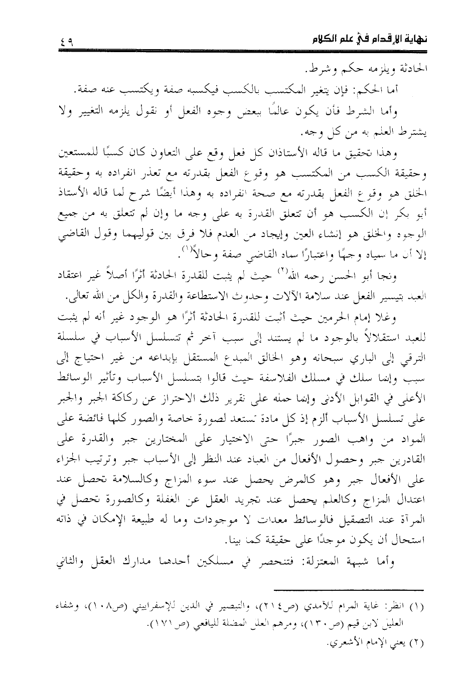 (1) انظر: غاية المرام للآمدي (ص 214)، والتبصير في الدين للأسفراييني (ص 108)، وشفاء العليل لابن قيم (ص 130)، ومرهم العلل المضلة لليافعي (ص 171).
