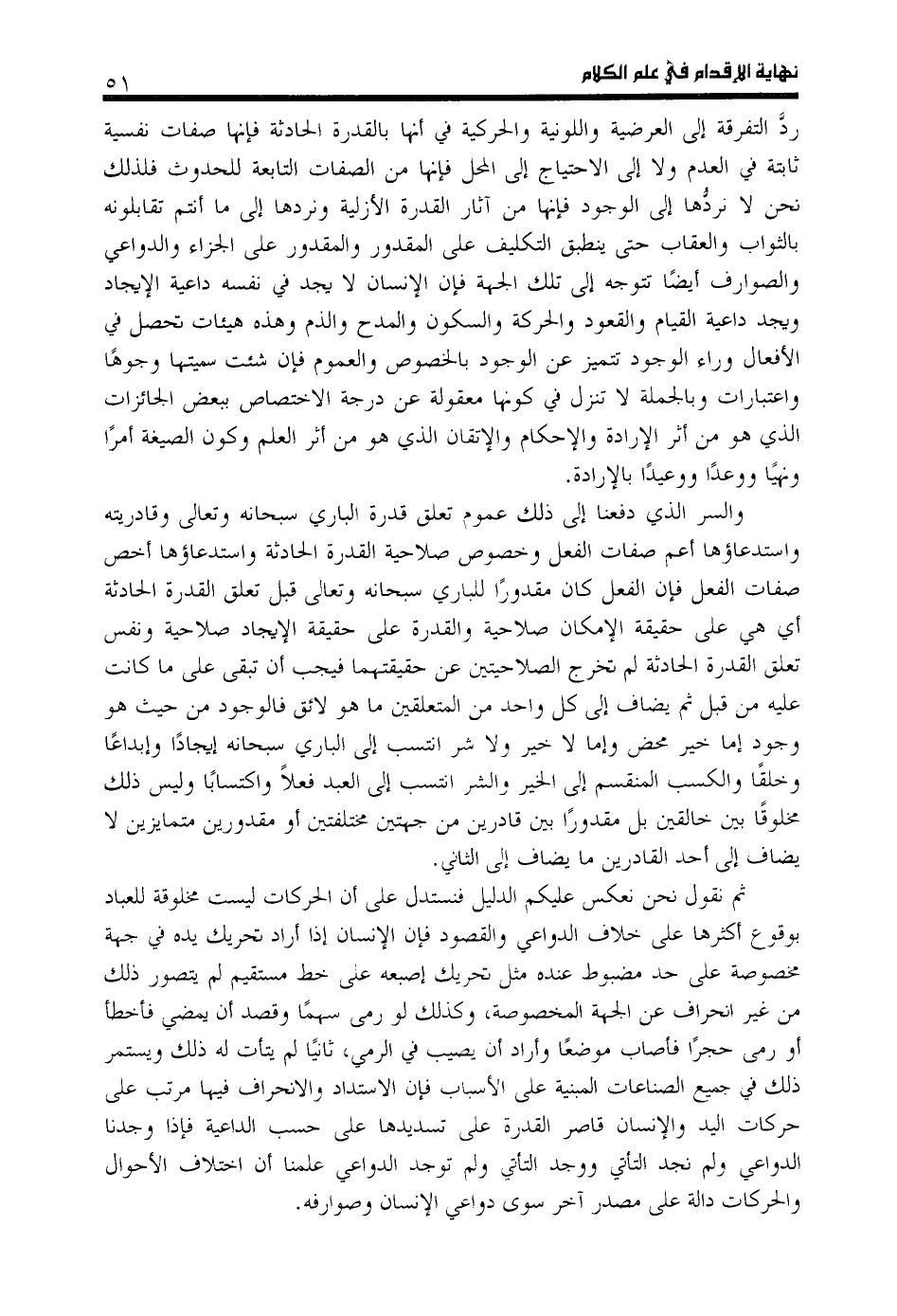 ردّ التفرقة إلى العرضية واللونية والحركية في أنها بالقدرة الحادثة فإنها صفات نفسية ثابتة في العدم ولا إلى الاحتياج إلى المحل فإنها من الصفات التابعة للحدوث فلذلك نحن لا نردّها إلى الوجود فإنها من آثار القدرة الأزلية ونردها إلى ما أنتم تقابلونه بالثواب والعقاب حتى ينطبق التكليف على المقدور والمقدور على الجزاء والدواعي والصوارف أيضا تتوجه إلى تلك الجهة فإن الإنسان لا يجد في نفسه داعية الإيجاد ويجد داعية القيام والقعود والحركة والسكون والمدح والذم وهذه هيئات تحصل في الأفعال وراء الوجود تتميز عن الوجود بالخصوص والعموم فإن شئت سميتها وجوها واعتبارات وبالجملة لا تنزل في كونها معقولة عن درجة الاختصاص ببعض الجائزات الذي هو من أثر الإرادة والإحكام والإتقان الذي هو من أثر العلم وكون الصيغة أمرا ونهيا ووعدا ووعيدا بالإرادة.