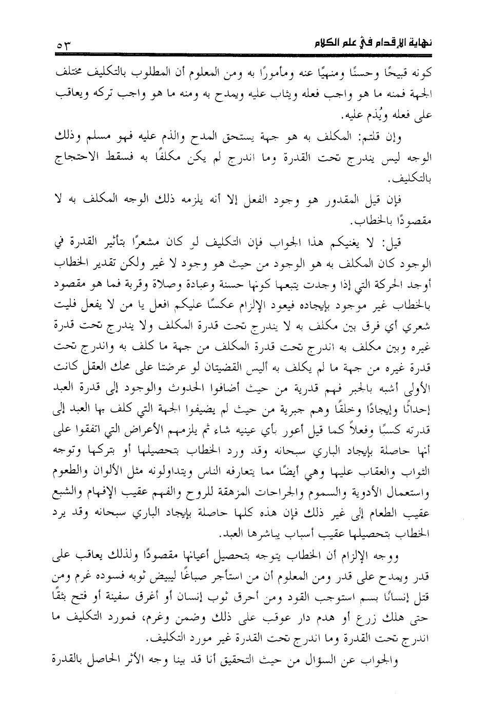 قيل: لا يغنيكم هذا الجواب فإن التكليف لو كان مشعرا بتأثير القدرة في الوجود كان المكلف به هو الوجود من حيث هو وجود لا غير ولكن تقدير الخطاب أوجد الحركة التي إذا وجدت يتبعها كونها حسنة وعبادة وصلاة وقربة فما هو مقصود بالخطاب غير موجود بإيجاده فيعود الإلزام عكسا عليكم افعل يا من لا يفعل فليت شعري أي فرق بين مكلف به لا يندرج تحت قدرة المكلف ولا يندرج تحت قدرة غيره وبين مكلف به اندرج تحت قدرة المكلف من جهة ما كلف به واندرج تحت قدرة غيره من جهة ما لم يكلف به أ ليس القضيتان لو عرضتا على محك العقل كانت الأولى أشبه بالجبر فهم قدرية من حيث أضافوا الحدوث والوجود إلى قدرة العبد إحداثا وإيجادا وخلقا وهم جبرية من حيث لم يضيفوا الجهة التي كلف بها العبد إلى قدرته كسبا وفعلا كما قيل أعور بأي عينيه شاء ثم يلزمهم الأعراض التي اتفقوا على أنها حاصلة بإيجاد الباري سبحانه وقد ورد الخطاب بتحصيلها أو بتركها وتوجه الثواب والعقاب عليها وهي أيضا مما يتعارفه الناس ويتداولونه مثل الألوان والطعوم واستعمال الأدوية والسموم والجراحات المزهقة للروح والفهم عقيب الإفهام والشبع عقيب الطعام إلى غير ذلك فإن هذه كلها حاصلة بإيجاد الباري سبحانه وقد يرد الخطاب بتحصيلها عقيب أسباب يباشرها العبد.