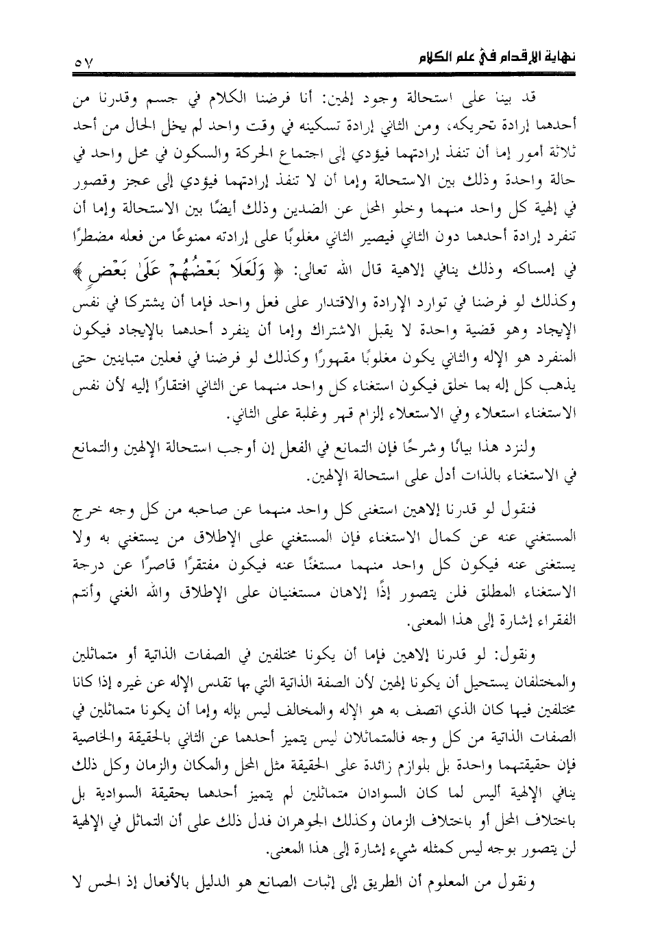 ونقول: لو قدرنا إلهين فإما أن يكونا مختلفين في الصفات الذاتية أو متماثلين والمختلفان يستحيل أن يكونا إلهين لأن الصفة الذاتية التي بها تقدس الإله عن غيره إذا كانا مختلفين فيها كان الذي اتصف به هو الإله والمخالف ليس بإله وإما أن يكونا متماثلين في الصفات الذاتية من كل وجه فالمتماثلان ليس يتميز أحدهما عن الثاني بالحقيقة والخاصية فإن حقيقتهما واحدة بل بلوازم زائدة على الحقيقة مثل المحل والمكان والزمان وكل ذلك ينافي الإلهية أ ليس لما كان السوادان متماثلين لم يتميز أحدهما بحقيقة السوادية بل باختلاف المحل أو باختلاف الزمان وكذلك الجوهران فدل ذلك على أن التماثل في الإلهية لن يتصور بوجه ليس كمثله شي ء إشارة إلى هذا المعنى.