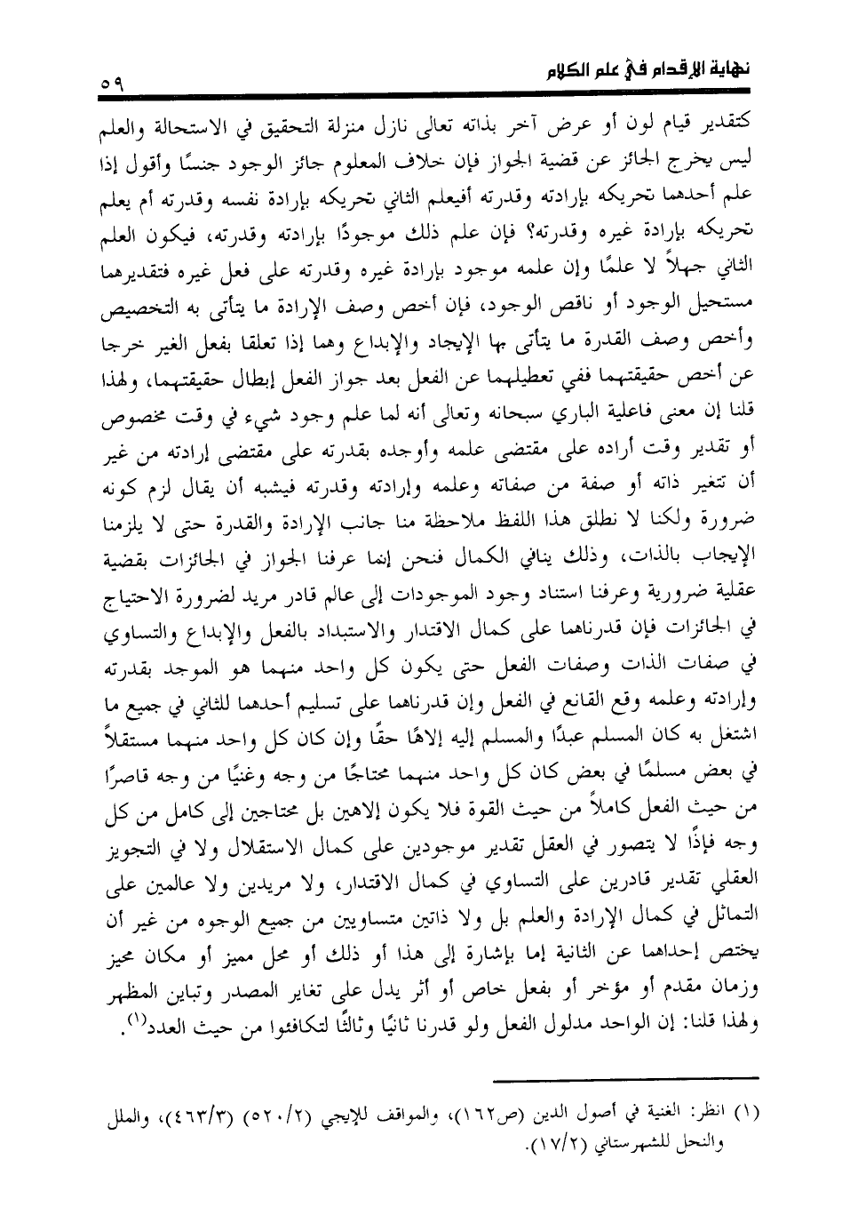 كتقدير قيام لون أو عرض آخر بذاته تعالى نازل منزلة التحقيق في الاستحالة والعلم ليس يخرج الجائز عن قضية الجواز فإن خلاف المعلوم جائز الوجود جنسا وأقول إذا علم أحدهما تحريكه بإرادته وقدرته أ فيعلم الثاني تحريكه بإرادة نفسه وقدرته أم يعلم تحريكه بإرادة غيره وقدرته؟ فإن علم ذلك موجودا بإرادته وقدرته، فيكون العلم الثاني جهلا لا علما وإن علمه موجود بإرادة غيره وقدرته على فعل غيره فتقديرهما مستحيل الوجود أو ناقص الوجود، فإن أخص وصف الإرادة ما يتأتى به التخصيص وأخص وصف القدرة ما يتأتى بها الإيجاد والإبداع وهما إذا تعلقا بفعل الغير خرجا عن أخص حقيقتهما ففي تعطيلهما عن الفعل بعد جواز الفعل إبطال حقيقتهما، ولهذا قلنا إن معنى فاعلية الباري سبحانه وتعالى أنه لما علم وجود شي ء في وقت مخصوص أو تقدير وقت أراده على مقتضى علمه وأوجده بقدرته على مقتضى إرادته من غير أن تتغير ذاته أو صفة من صفاته وعلمه وإرادته وقدرته فيشبه أن يقال لزم كونه ضرورة ولكنا لا نطلق هذا اللفظ ملاحظة منا جانب الإرادة والقدرة حتى لا يلزمنا الإيجاب بالذات، وذلك ينافي الكمال فنحن إنما عرفنا الجواز في الجائزات بقضية عقلية ضرورية وعرفنا استناد وجود الموجودات إلى عالم قادر مريد لضرورة الاحتياج في الجائزات فإن قدرناهما على كمال الاقتدار والاستبداد بالفعل والإبداع والتساوي في صفات الذات وصفات الفعل حتى يكون كل واحد منهما هو الموجد بقدرته وإرادته وعلمه وقع القانع في الفعل وإن قدرناهما على تسليم أحدهما للثاني في جميع ما اشتغل به كان المسلم عبدا والمسلم إليه إلها حقا وإن كان كل واحد منهما مستقلا في بعض مسلما في بعض كان كل واحد منهما محتاجا من وجه وغنيا من وجه قاصرا من حيث الفعل كاملا من حيث القوة فلا يكون إلهين بل محتاجين إلى كامل من كل وجه فإذا لا يتصور في العقل تقدير موجودين على كمال الاستقلال ولا في التجويز العقلي تقدير قادرين على التساوي في كمال الاقتدار، ولا مريدين ولا عالمين على التماثل في كمال الإرادة والعلم بل ولا ذاتين متساويين من جميع الوجوه من غير أن يختص إحداهما عن الثانية إما بإشارة إلى هذا أو ذلك أو محل مميز أو مكان محيز وزمان مقدم أو مؤخر أو بفعل خاص أو أثر يدل على تغاير المصدر وتباين المظهر ولهذا قلنا: إن الواحد مدلول الفعل ولو قدرنا ثانيا وثالثا لتكافئوا من حيث العدد «1».
