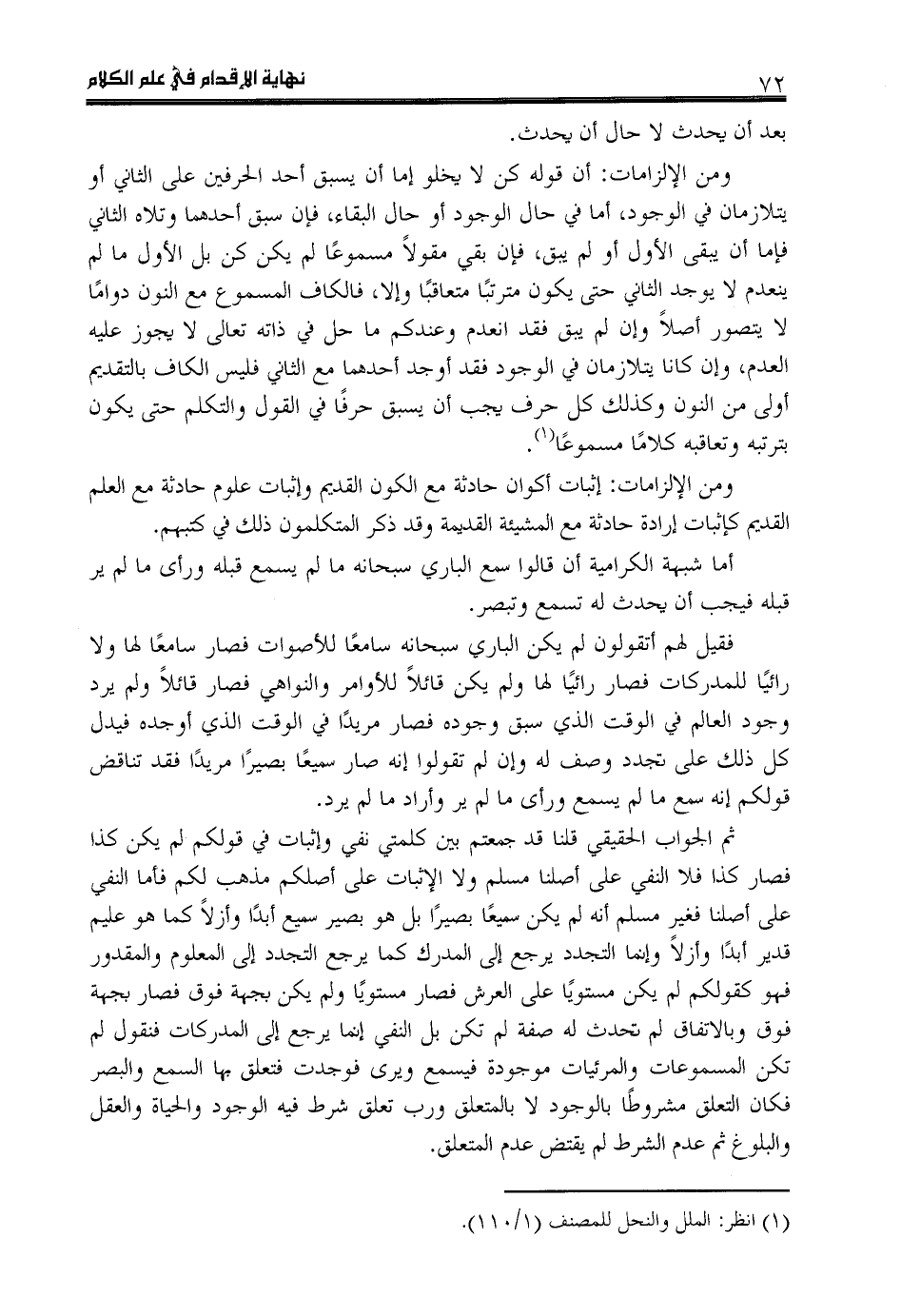 ومن الإلزامات: أن قوله كن لا يخلو إما أن يسبق أحد الحرفين على الثاني أو يتلازمان في الوجود، أما في حال الوجود أو حال البقاء، فإن سبق أحدهما وتلاه الثاني فإما أن يبقى الأول أو لم يبق، فإن بقي مقولا مسموعا لم يكن كن بل الأول ما لم ينعدم لا يوجد الثاني حتى يكون مترتبا متعاقبا وإلا، فالكاف المسموع مع النون دواما لا يتصور أصلا وإن لم يبق فقد انعدم وعندكم ما حل في ذاته تعالى لا يجوز عليه العدم، وإن كانا يتلازمان في الوجود فقد أوجد أحدهما مع الثاني فليس الكاف بالتقديم أولى من النون وكذلك كل حرف يجب أن يسبق حرفا في القول والتكلم حتى يكون بترتبه وتعاقبه كلاما مسموعا «1».