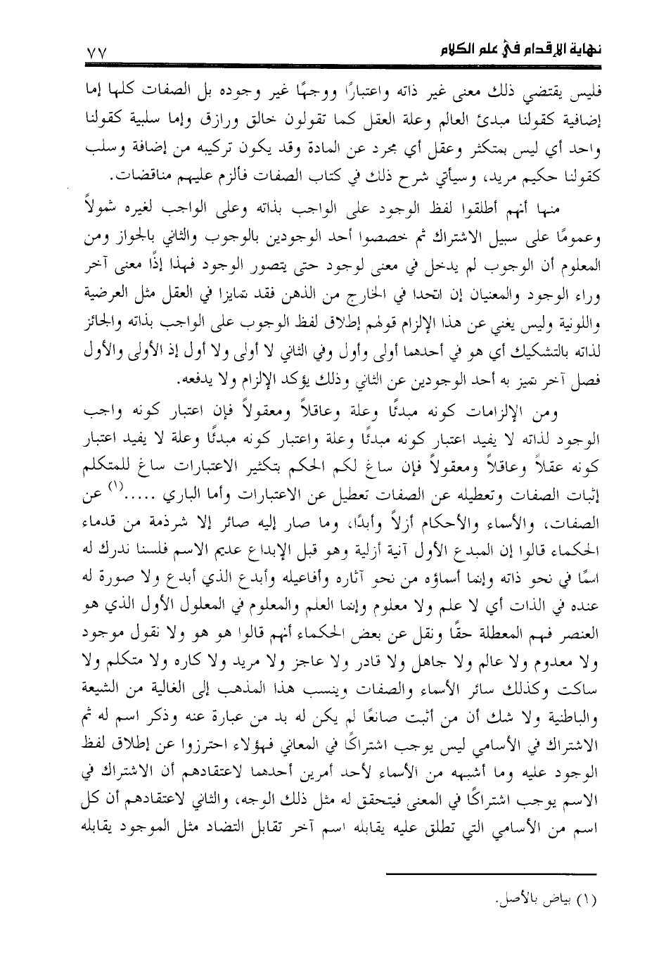 ومن الإلزامات كونه مبدئا وعلة وعاقلا ومعقولا فإن اعتبار كونه واجب الوجود لذاته لا يفيد اعتبار كونه مبدئا وعلة واعتبار كونه مبدئا وعلة لا يفيد اعتبار كونه عقلا وعاقلا ومعقولا فإن ساغ لكم الحكم بتكثير الاعتبارات ساغ للمتكلم إثبات الصفات وتعطيله عن الصفات تعطيل عن الاعتبارات وأما الباري ..... «1» عن الصفات، والأسماء والأحكام أزلا وأبدا، وما صار إليه صائر إلا شرذمة من قدماء الحكماء قالوا إن المبدع الأول آنية أزلية وهو قبل الإبداع عديم الاسم فلسنا ندرك له اسما في نحو ذاته وإنما أسماؤه من نحو آثاره وأفاعيله وأبدع الذي أبدع ولا صورة له عنده في الذات أي لا علم ولا معلوم وإنما العلم والمعلوم في المعلول الأول الذي هو العنصر فهم المعطلة حقا ونقل عن بعض الحكماء أنهم قالوا هو هو ولا نقول موجود ولا معدوم ولا عالم ولا جاهل ولا قادر ولا عاجز ولا مريد ولا كاره ولا متكلم ولا ساكت وكذلك سائر الأسماء والصفات وينسب هذا المذهب إلى الغالية من الشيعة والباطنية ولا شك أن من أثبت صانعا لم يكن له بد من عبارة عنه وذكر اسم له ثم الاشتراك في الأسامي ليس يوجب اشتراكا في المعاني فهؤلاء احترزوا عن إطلاق لفظ الوجود عليه وما أشبهه من الأسماء لأحد أمرين أحدهما لاعتقادهم أن الاشتراك في الاسم يوجب اشتراكا في المعنى فيتحقق له مثل ذلك الوجه، والثاني لاعتقادهم أن كل اسم من الأسامي التي تطلق عليه يقابله اسم آخر تقابل التضاد مثل الموجود يقابله