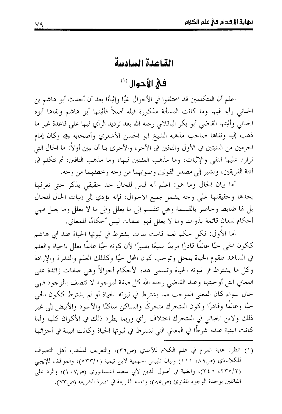 اعلم أن المتكلمين قد اختلفوا في الأحوال نفيا وإثباتا بعد أن أحدث أبو هاشم بن الجبائي رأيه فيها وما كانت المسألة مذكورة قبله أصلا فأثبتها أبو هاشم ونفاها أبوه الجبائي وأثبتها القاضي أبو بكر الباقلاني رحمه اللّه بعد ترديد الرأي فيها على قاعدة غير ما ذهب إليه ونفاها صاحب مذهبه الشيخ أبو الحسن الأشعري وأصحابه رضي اللّه عنهم وكان إمام الحرمين من المثبتين في الأول والنافين في الآخر، والأحرى بنا أن نبين أولا: ما الحال التي توارد عليها النفي والإثبات، وما مذهب المثبتين فيها، وما مذهب النافين، ثم نتكلم في أدلة الفريقين، ونشير إلى مصدر القولين وصوابهما من وجه وخطئهما من وجه.