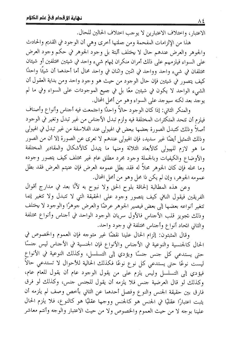 وقال المثبتون: إلزام الحال علينا نقضا غير متوجه فإن العموم والخصوص في الحال كالجنسية والنوعية في الأجناس والأنواع فإن الجنسية في الأجناس ليس جنسا حتى يستدعي كل جنس جنسا ويؤدي إلى التسلسل، وكذلك النوعية في الأنواع ليست نوعا حتى يستدعي كل نوع نوعا فكذلك الحالية للأحوال لا تستدعي حالا فيؤدي إلى التسلسل وليس يلزم على من يقول الوجود عام أن يقول للعام عام، وكذلك لو قال العرضية جنس فلا يلزمه أن يقول للجنس جنس، وكذلك لو فرق فارق بين حقيقة الجنس والنوع وفصل أحدهما عن الثاني بأخص وصف لم يلزمه أن يثبت اعتبارا عقليا في الجنس هو كالجنس ووجها عقليا هو كالنوع، فلا يلزم الحال علينا بوجه لا من حيث العموم والخصوص ولا من حيث الاعتبار والوجه وأنتم معاشر