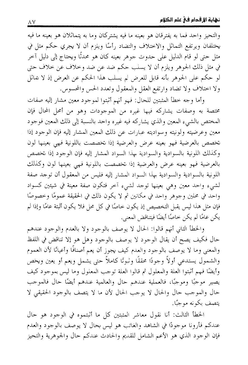 وأما وجه خطأ المثبتين للحال: فهو أنهم أثبتوا لموجود معين مشار إليه صفات مختصة به وصفات يشاركه فيها غيره من الموجودات وهو من أمحل المحال فإن المختص بالشي ء المعين والذي يشاركه فيه غيره واحد بالنسبة إلى ذلك المعين فوجود معين وعرضيته ولونيته وسواديته عبارات عن ذلك المعين المشار إليه فإن الوجود إذا تخصص بالعرضية فهو بعينه عرض والعرضية إذا تخصصت باللونية فهي بعينها لون وكذلك اللونية بالسوادية والسوادية بهذا السواد المشار إليه فإن الوجود إذا تخصص بالعرضية فهو بعينه عرض والعرضية إذا تخصصت باللونية فهي بعينها لون وكذلك اللونية بالسوادية والسوادية بهذا السواد المشار إليه فليس من المعقول أن توجد صفة لشي ء واحد معين وهي بعينها توجد لشي ء آخر فتكون صفة معينة في شيئين كسواد واحد في محلين وجوهر واحد في مكانين ثم لا يكون ذلك في الحقيقة عموما وخصوصا فإن مثل هذا ليس يقبل التخصيص إذ يكون خاصا في كل محل فلا يكون البتة عاما وإذا لم يكن عاما لم يكن خاصا أيضا فيتناقض المعنى.