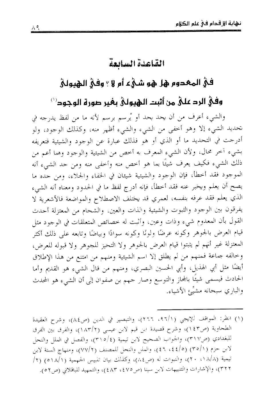القاعدة السابعة في المعدوم هل هو شي ء أم لا؟ وفي الهيولى وفي الرد على من أثبت الهيولى بغير صورة الوجود «1»