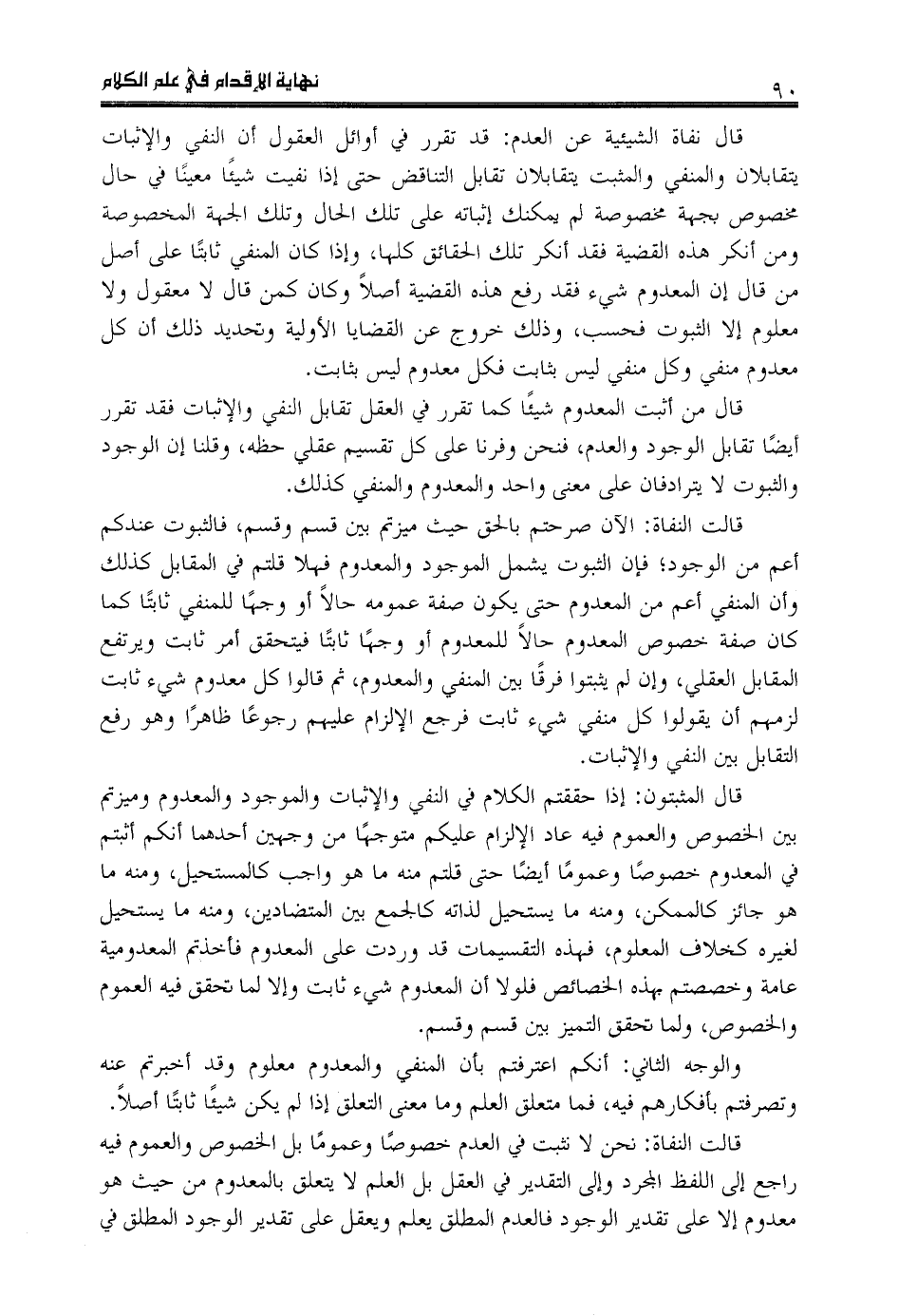 قال من أثبت المعدوم شيئا كما تقرر في العقل تقابل النفي والإثبات فقد تقرر أيضا تقابل الوجود والعدم، فنحن وفرنا على كل تقسيم عقلي حظه، وقلنا إن الوجود والثبوت لا يترادفان على معنى واحد والمعدوم والمنفي كذلك.