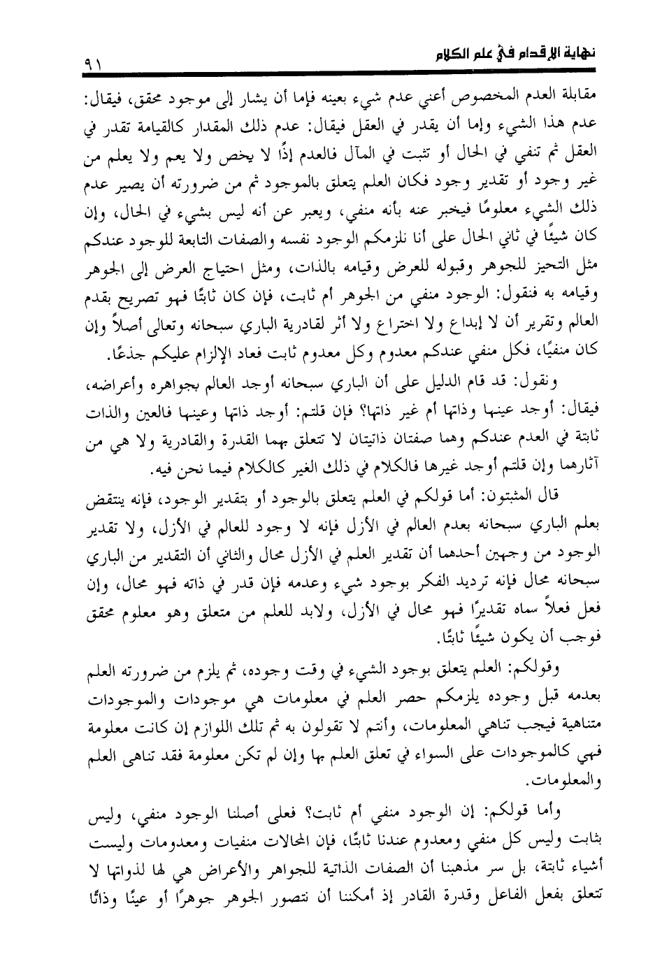 عدم هذا الشي ء وإما أن يقدر في العقل فيقال: عدم ذلك المقدار كالقيامة تقدر في العقل ثم تنفي في الحال أو تثبت في المآل فالعدم إذا لا يخص ولا يعم ولا يعلم من غير وجود أو تقدير وجود فكان العلم يتعلق بالموجود ثم من ضرورته أن يصير عدم ذلك الشي ء معلوما فيخبر عنه بأنه منفي، ويعبر عن أنه ليس بشي ء في الحال، وإن كان شيئا في ثاني الحال على أنا نلزمكم الوجود نفسه والصفات التابعة للوجود عندكم مثل التحيز للجوهر وقبوله للعرض وقيامه بالذات، ومثل احتياج العرض إلى الجوهر وقيامه به فنقول: الوجود منفي من الجوهر أم ثابت، فإن كان ثابتا فهو تصريح بقدم العالم وتقرير أن لا إبداع ولا اختراع ولا أثر لقادرية الباري سبحانه وتعالى أصلا وإن كان منفيا، فكل منفي عندكم معدوم وكل معدوم ثابت فعاد الإلزام عليكم جذعا.