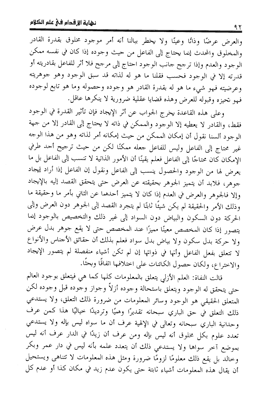 وعلى هذه القاعدة يخرج الجواب عن أثر الإيجاد فإن تأثير القدرة في الوجود فقط، والقادر لا يعطيه إلا الوجود والممكن في ذاته لا يحتاج إلى القادر إلا من جهة الوجود ألسنا نقول أن إمكان الممكن من حيث إمكانه أمر لذاته وهو من هذا الوجه غير محتاج إلى الفاعل وليس للفاعل جعله ممكنا لكن من حيث ترجيح أحد طرفي الإمكان كان محتاجا إلى الفاعل فعلم يقينا أن الأمور الذاتية لا تنسب إلى الفاعل بل ما يعرض لها من الوجود والحصول ينسب إلى الفاعل ونقول إن الفاعل إذا أراد إيجاد جوهر، فلا بد أن يتميز الجوهر بحقيقته عن العرض حتى يتحقق القصد إليه بالإيجاد وإلا فالجوهر والعرض في العدم إذا كان لا يتميز أحدهما عن الثاني بأمر ما وحقيقة ما وذلك الأمر والحقيقة لم يكن شيئا ثابتا لم يتجرد القصد إلى الجوهر دون العرض وإلى الحركة دون السكون والبياض دون السواد إلى غير ذلك والتخصيص بالوجود إنما يتصور إذا كان المخصص معينا مميزا عند المخصص حتى لا يقع جوهر بدل عرض ولا حركة بدل سكون ولا بياض بدل سواد فعلم بذلك أن حقائق الأجناس والأنواع لا تتعلق بفعل الفاعل وأنها في ذواتها إن لم تكن أشياء منفصلة لم يتصور الإيجاد والاختراع، ولكان حصول الكائنات على اختلافها اتفاقا وبحثا.