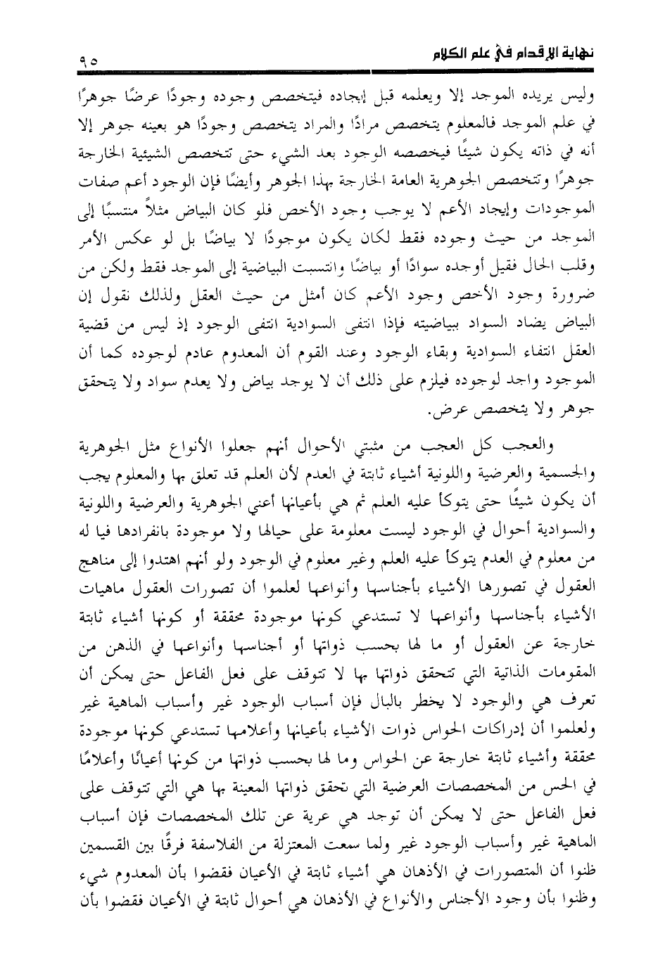 والعجب كل العجب من مثبتي الأحوال أنهم جعلوا الأنواع مثل الجوهرية والجسمية والعرضية واللونية أشياء ثابتة في العدم لأن العلم قد تعلق بها والمعلوم يجب أن يكون شيئا حتى يتوكأ عليه العلم ثم هي بأعيانها أعني الجوهرية والعرضية واللونية والسوادية أحوال في الوجود ليست معلومة على حيالها ولا موجودة بانفرادها فيا له من معلوم في العدم يتوكأ عليه العلم وغير معلوم في الوجود ولو أنهم اهتدوا إلى مناهج العقول في تصورها الأشياء بأجناسها وأنواعها لعلموا أن تصورات العقول ماهيات الأشياء بأجناسها وأنواعها لا تستدعي كونها موجودة محققة أو كونها أشياء ثابتة خارجة عن العقول أو ما لها بحسب ذواتها أو أجناسها وأنواعها في الذهن من المقومات الذاتية التي تتحقق ذواتها بها لا تتوقف على فعل الفاعل حتى يمكن أن تعرف هي والوجود لا يخطر بالبال فإن أسباب الوجود غير وأسباب الماهية غير ولعلموا أن إدراكات الحواس ذوات الأشياء بأعيانها وأعلامها تستدعي كونها موجودة محققة وأشياء ثابتة خارجة عن الحواس وما لها بحسب ذواتها من كونها أعيانا وأعلاما في الحس من المخصصات العرضية التي تحقق ذواتها المعينة بها هي التي تتوقف على فعل الفاعل حتى لا يمكن أن توجد هي عرية عن تلك المخصصات فإن أسباب الماهية غير وأسباب الوجود غير ولما سمعت المعتزلة من الفلاسفة فرقا بين القسمين ظنوا أن المتصورات في الأذهان هي أشياء ثابتة في الأعيان فقضوا بأن المعدوم شي ء وظنوا بأن وجود الأجناس والأنواع في الأذهان هي أحوال ثابتة في الأعيان فقضوا بأن