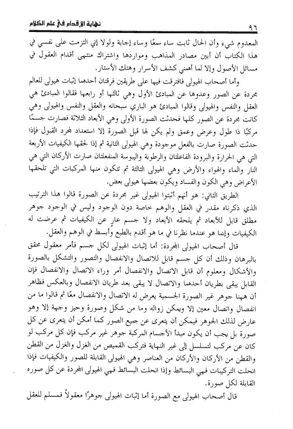 الطريق الثاني: هو أنهم أثبتوا الهيولى غير مجردة عن الصورة قالوا هذا الترتيب الذي ذكرناه مقدر في العقل والوهم خاصة دون الوجود وليس في الوجود جوهر مطلق قابل للأبعاد ثم يلحقه الأبعاد ولا جسم عار عن الكيفيات ثم عرضت له الكيفيات وإنما هو عند ما نظرنا في ما هو أقدم بالطبع وأبسط في الوهم والعقل.