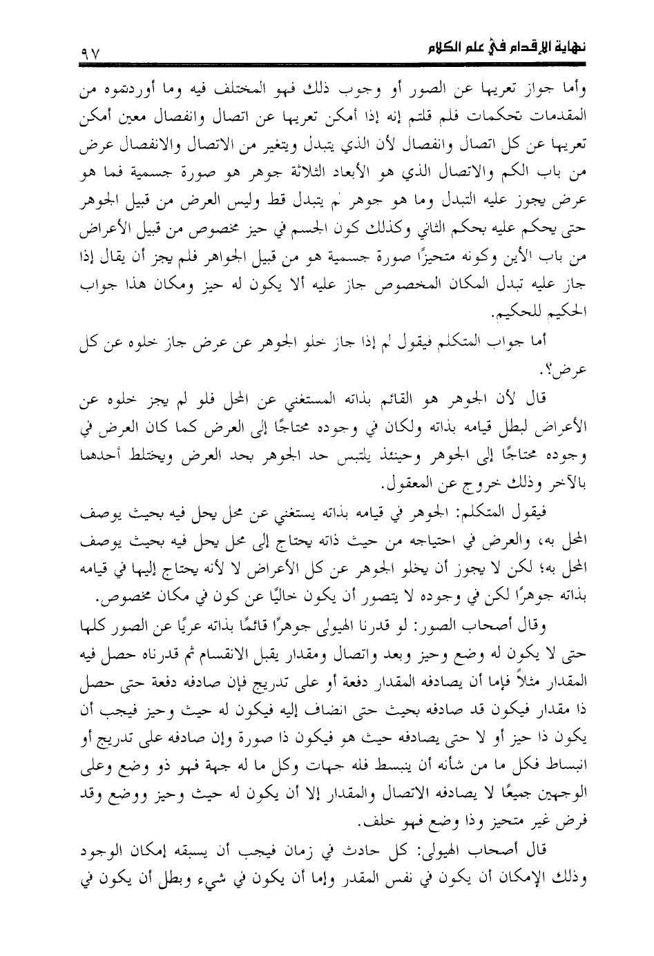 وأما جواز تعريها عن الصور أو وجوب ذلك فهو المختلف فيه وما أوردتموه من المقدمات تحكمات فلم قلتم إنه إذا أمكن تعريها عن اتصال وانفصال معين أمكن تعريها عن كل اتصال وانفصال لأن الذي يتبدل ويتغير من الاتصال والانفصال عرض من باب الكم والاتصال الذي هو الأبعاد الثلاثة جوهر هو صورة جسمية فما هو عرض يجوز عليه التبدل وما هو جوهر لم يتبدل قط وليس العرض من قبيل الجوهر حتى يحكم عليه بحكم الثاني وكذلك كون الجسم في حيز مخصوص من قبيل الأعراض من باب الأين وكونه متحيزا صورة جسمية هو من قبيل الجواهر فلم يجز أن يقال إذا جاز عليه تبدل المكان المخصوص جاز عليه ألا يكون له حيز ومكان هذا جواب الحكيم للحكيم.