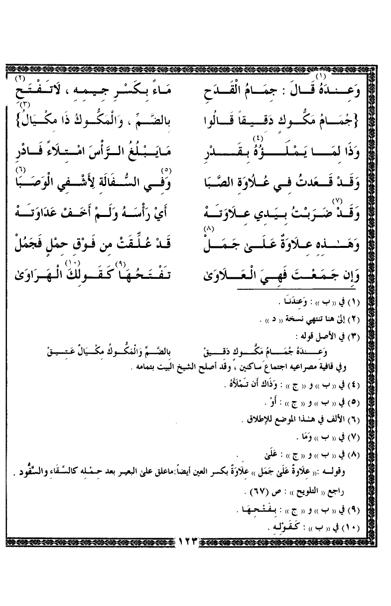 وعنده قالَ جِمامُ القدحِ ... ماء بكسر جيمه لا تفتحِ