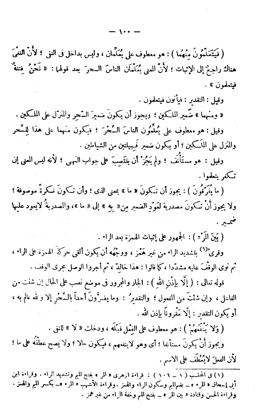 وَقِيلَ: هُوَ مَعْطُوفٌ عَلَى يُعَلِّمُونَ النَّاسَ السِّحْرَ فَيَكُونُ مِنْهُمَا عَلَى هَذَا لِلسِّحْرِ وَالْمُنَزَّلِ عَلَى الْمَلَكَيْنِ أَوْ يَكُونُ ضَمِيرَ قَبِيلَتَيْنِ مِنَ الشَّيَاطِينِ. وَقِيلَ: هُوَ مُسْتَأْنَفٌ وَلَمْ يَجُزْ أَنْ يُنْتَصَبَ عَلَى جَوَابِ النَّهْيِ ; لِأَنَّهُ لَيْسَ الْمَعْنَى إِنْ تَكْفُرْ يَتَعَلَّمُوا. (مَا يُفَرِّقُونَ) : يَجُوزُ أَنْ تَكُونَ: «مَا» بِمَعْنَى الَّذِي، وَأَنْ تَكُونَ نَكِرَةً مَوْصُوفَةً، وَلَا يَجُوزُ أَنْ تَكُونَ مَصْدَرِيَّةً لِعَوْدِ الضَّمِيرِ مِنْ: «بِهِ» إِلَى «مَا» وَالْمَصْدَرِيَّةُ لَا يَعُودُ عَلَيْهَا ضَمِيرٌ.