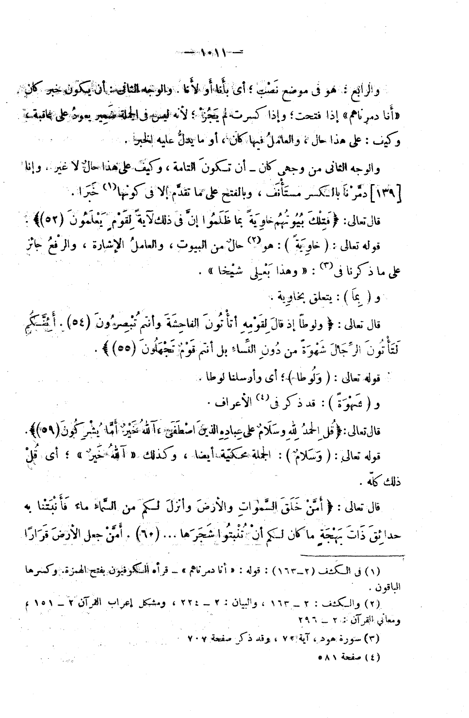 وَالرَّابِعُ: هُوَ فِي مَوْضِعِ نَصْبٍ؛ أَيْ بِأَنَّا أَوْ لِأَنَّا. وَالْوَجْهُ الثَّانِي: أَنْ يَكُونَ خَبَرُ كَانَ: «أَنَّا دَمَّرْنَاهُمْ» إِذَا فُتِحَتْ؛ وَإِذَا كُسِرَتْ لَمْ يَجُزْ؛ لِأَنَّهُ لَيْسَ فِي الْجُمْلَةِ ضَمِيرٌ يَعُودُ عَلَى عَاقِبَةٍ، وَكَيْفَ عَلَى هَذَا: حَالٌ، وَالْعَامِلُ فِيهَا كَانَ، أَوْ مَا يَدُلُّ عَلَيْهِ الْخَبَرُ.