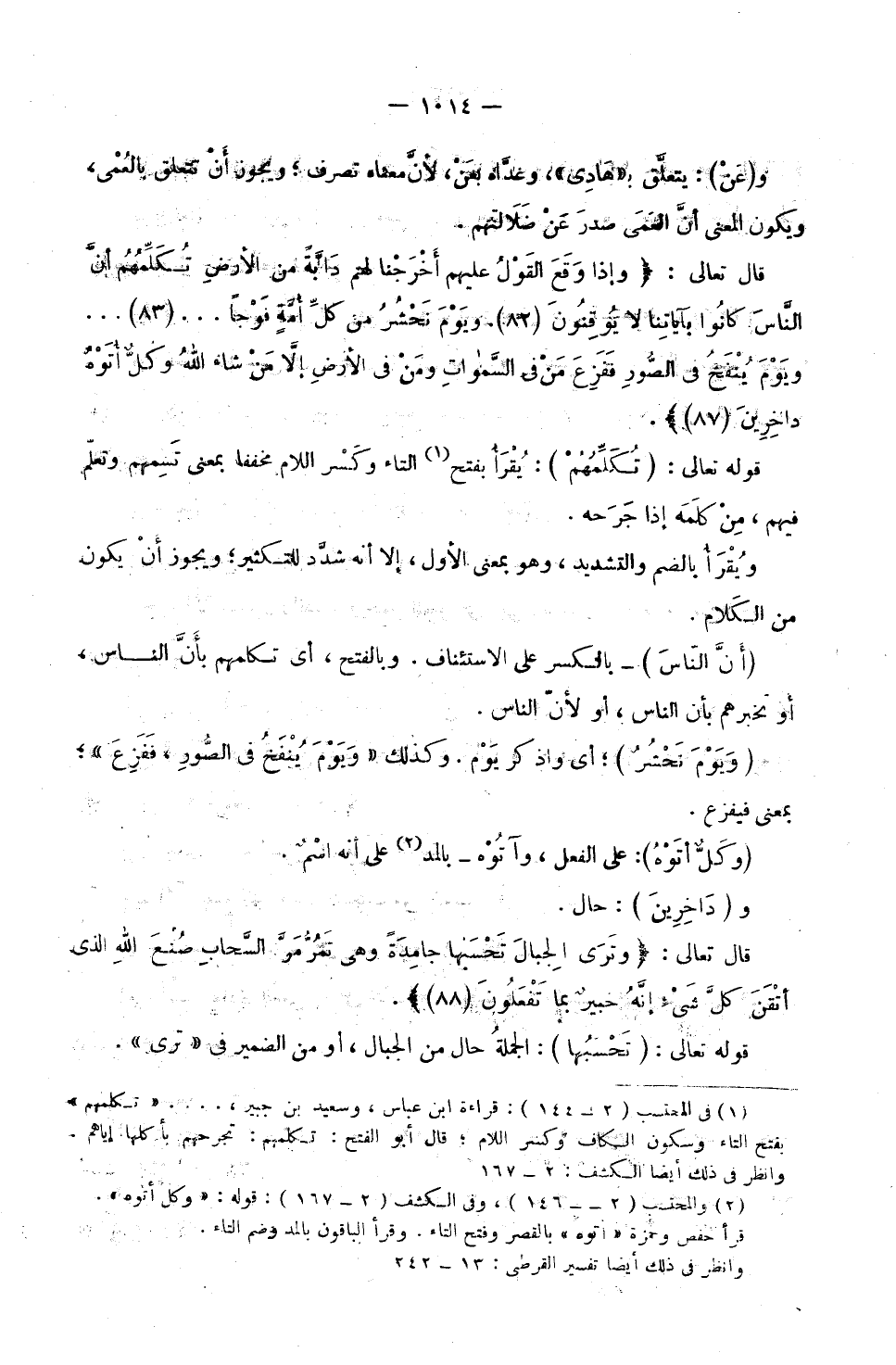 قَالَ تَعَالَى: (وَإِذَا وَقَعَ الْقَوْلُ عَلَيْهِمْ أَخْرَجْنَا لَهُمْ دَابَّةً مِنَ الْأَرْضِ تُكَلِّمُهُمْ أَنَّ النَّاسَ كَانُوا بِآيَاتِنَا لَا يُوقِنُونَ (82) وَيَوْمَ نَحْشُرُ مِنْ كُلِّ أُمَّةٍ فَوْجًا مِمَّنْ يُكَذِّبُ بِآيَاتِنَا فَهُمْ يُوزَعُونَ (83) حَتَّى إِذَا جَاءُوا قَالَ أَكَذَّبْتُمْ بِآيَاتِي وَلَمْ تُحِيطُوا بِهَا عِلْمًا أَمْ مَاذَا كُنْتُمْ تَعْمَلُونَ (84) وَوَقَعَ الْقَوْلُ عَلَيْهِمْ بِمَا ظَلَمُوا فَهُمْ لَا يَنْطِقُونَ (85) أَلَمْ يَرَوْا أَنَّا جَعَلْنَا اللَّيْلَ لِيَسْكُنُوا فِيهِ وَالنَّهَارَ مُبْصِرًا إِنَّ فِي ذَلِكَ لَآيَاتٍ لِقَوْمٍ يُؤْمِنُونَ (86) وَيَوْمَ يُنْفَخُ فِي الصُّورِ فَفَزِعَ مَنْ فِي السَّمَاوَاتِ وَمَنْ فِي الْأَرْضِ إِلَّا مَنْ شَاءَ اللَّهُ وَكُلٌّ أَتَوْهُ دَاخِرِينَ (87)) .