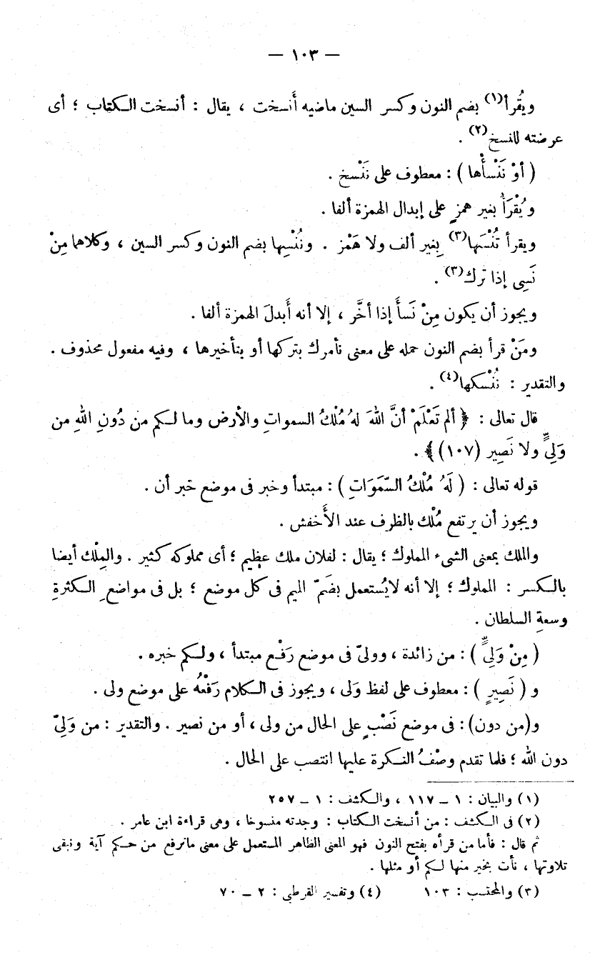 وَيُقْرَأُ تُنْسَهَا بِغَيْرِ أَلِفٍ وَلَا هَمْزٍ، وَنُنْسِهَا بِضَمِّ النُّونِ وَكَسْرِ السِّينِ، وَكِلَاهُمَا مِنْ نَسِيَ إِذَا تَرَكَ، وَيَجُوزُ أَنْ يَكُونَ مِنْ نَسَأَ إِذَا أَخَّرَ، إِلَّا أَنَّهُ أَبْدَلَ الْهَمْزَةَ أَلِفًا.