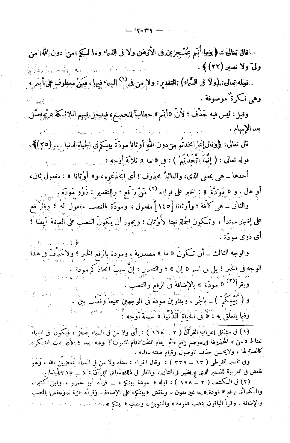 قَوْلُهُ تَعَالَى: (إِنَّمَا اتَّخَذْتُمْ) : فِي «مَا» ثَلَاثَةُ أَوْجُهٍ؛ أَحَدُهَا: هِيَ بِمَعْنَى الَّذِي، وَالْعَائِدُ مَحْذُوفٌ؛ أَيِ اتَّخَذْتُمُوهُ. وَ «أَوْثَانًا» مَفْعُولٌ ثَانٍ، أَوْ حَالٌ. وَ «مَوَدَّةَ» : الْخَبَرُ، عَلَى قِرَاءَةِ مَنْ رَفَعَ؛ وَالتَّقْدِيرُ: ذَوُو مَوَدَّةٍ. وَالثَّانِي: هِيَ كَافَّةٌ؛ وَأَوْثَانًا مَفْعُولٌ ومودة بِالنّصب مفعول لَهُ وبالرفع على إِضْمَار مُبْتَدأ وَتَكون الْجُمْلَة نعتا لأوثان. وَيَجُوزُ أَنْ يَكُونَ النَّصْبُ عَلَى الصِّفَةِ؛ أَيْضًا؛ أَيْ ذَوِي مَوَدَّةٍ. وَالْوَجْهُ الثَّالِثُ: أَنْ تَكُونَ «مَا» مَصْدَرِيَّةً، وَ «مَوَدَّةَ» بِالرَّفْعِ: الْخَبَرُ؛ وَلَا حَذْفَ فِي هَذَا الْوَجْهِ فِي الْخَبَرِ؛ بَلْ فِي اسْمِ «إِنَّ» وَالتَّقْدِيرُ: إِنَّ سَبَبَ اتِّخَاذِكُمْ مَوَدَّةٌ.