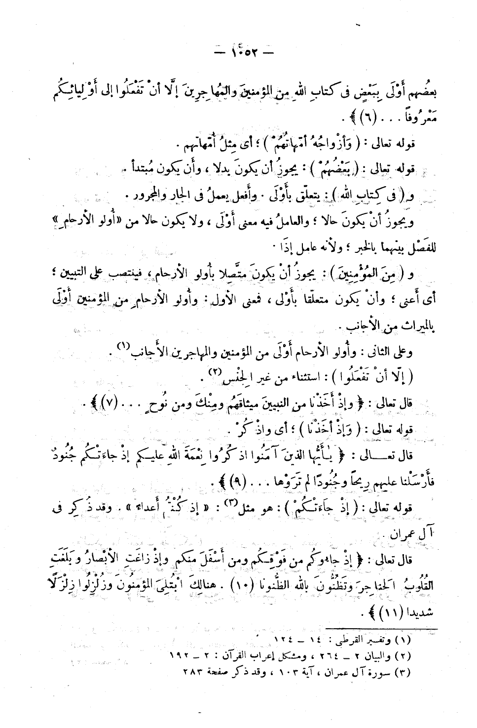 وَ (مِنَ الْمُؤْمِنِينَ) : يَجُوزُ أَنْ يَكُونَ مُتَّصِلًا بِأُولُوا الْأَرْحَامِ، فَيَنْتَصِبَ عَلَى التَّبْيِينِ؛ أَيْ أَعْنِي؛ وَأَنْ يَكُونَ مُتَعَلِّقًا بِأَوْلَى، فَمَعْنَى الْأَوَّلِ: وَأُولُوا الْأَرْحَامِ مِنَ الْمُؤْمِنِينَ أَوْلَى بِالْمِيرَاثِ مِنَ الْأَجَانِبِ. وَعَلَى الثَّانِي: وَأُولُوا الْأَرْحَامِ أَوْلَى مِنَ الْمُؤْمِنِينَ وَالْمُهَاجِرِينَ الْأَجَانِبِ.