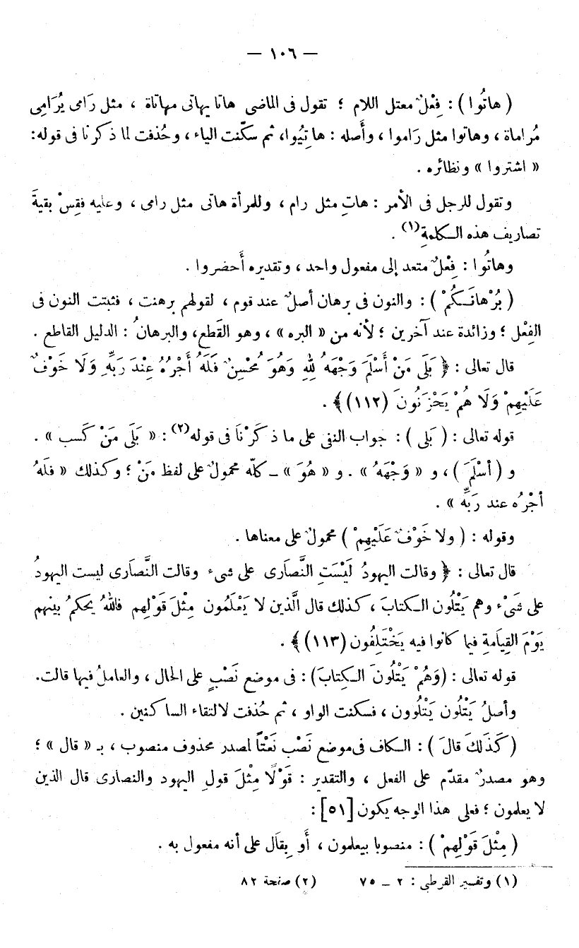 (بُرْهَانَكُمْ) : وَالنُّونُ فِي بُرْهَانٍ أَصْلٌ عِنْدَ قَوْمٍ ; لِقَوْلِهِمْ بَرْهَنْتُ فَثَبَتَتِ النُّونُ فِي الْفِعْلِ، وَزَائِدَةٌ عِنْدَ آخَرِينَ ; لِأَنَّهُ مِنْ «الْبَرَهِ» وَهُوَ الْقَطْعُ وَالْبُرْهَانُ الدَّلِيلُ الْقَاطِعُ.