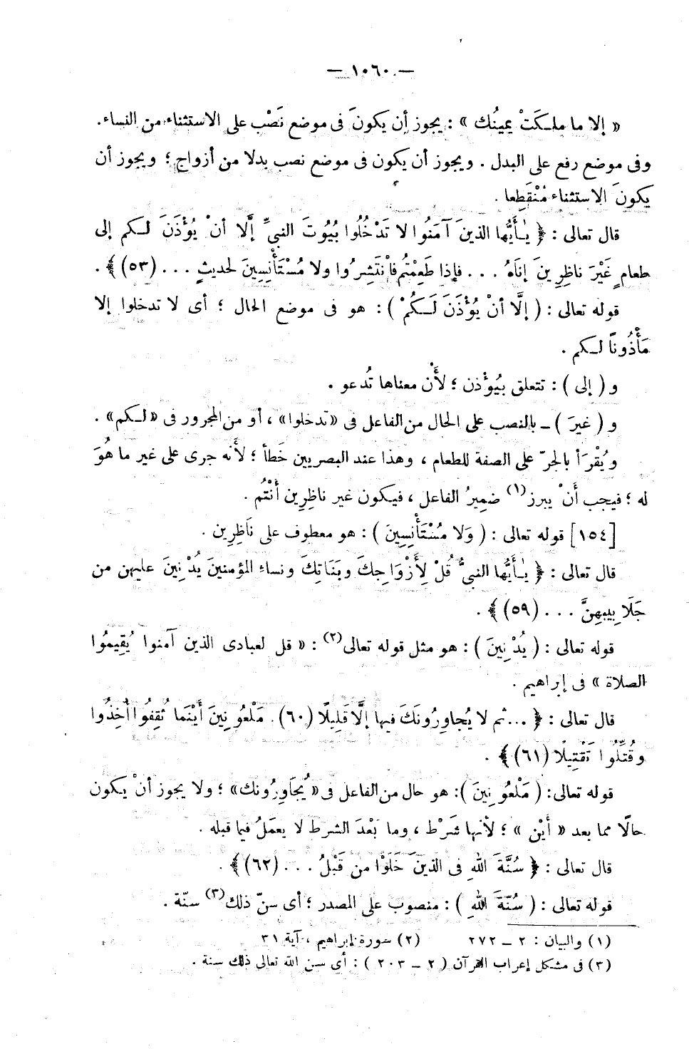 قَوْلُهُ تَعَالَى: (إِلَّا أَنْ يُؤْذَنَ لَكُمْ) : هُوَ فِي مَوْضِعِ الْحَالِ؛ أَيْ لَا تَدْخُلُوا إِلَّا مَأْذُونًا لَكُمْ.
