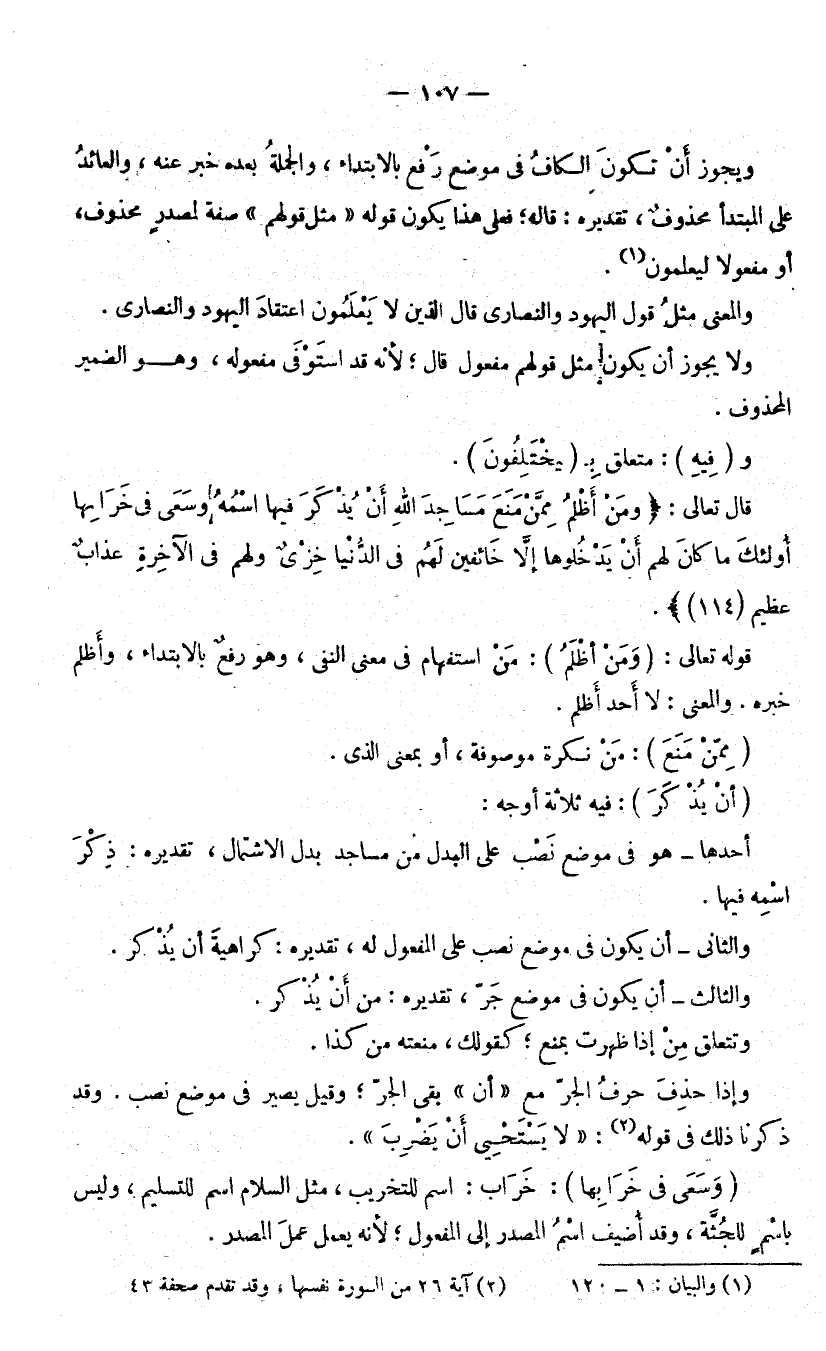 قَوْلُهُ تَعَالَى: (وَمَنْ أَظْلَمُ) : مَنِ اسْتِفْهَامٌ فِي مَعْنَى النَّفْيِ، وَهُوَ رَفْعٌ بِالِابْتِدَاءِ، وَأَظْلَمُ خَبَرُهُ، وَالْمَعْنَى لَا أَحَدَ أَظْلَمُ. (مِمَّنْ مَنَعَ) : مَنْ نَكِرَةٌ مَوْصُوفَةٌ، أَوْ بِمَعْنَى الَّذِي: «أَنْ يُذْكَرَ» فِيهِ ثَلَاثَةُ أَوْجُهٍ أَحَدُهَا هُوَ فِي مَوْضِعِ نَصْبٍ عَلَى الْبَدَلِ مِنْ مَسَاجِدَ، بَدَلُ الِاشْتِمَالِ تَقْدِيرُهُ: ذِكْرَ اسْمِهِ فِيهَا. وَالثَّانِي أَنْ يَكُونَ فِي مَوْضِعِ نَصْبٍ عَلَى الْمَفْعُولِ لَهُ، تَقْدِيرُهُ: كَرَاهِيَةَ أَنْ يُذْكَرَ.