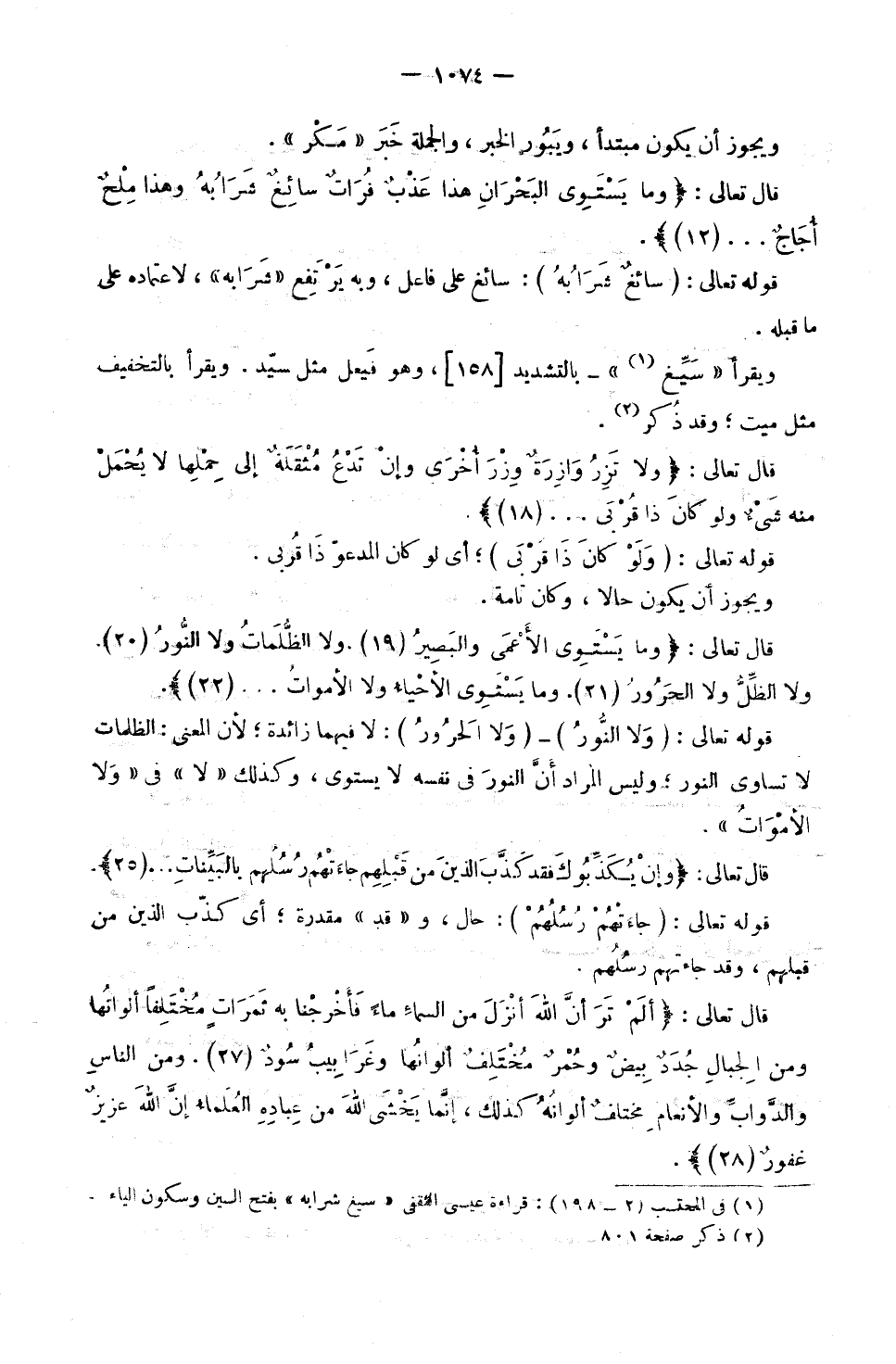 قَوْلُهُ تَعَالَى: (وَلَا النُّورُ) (وَلَا الْحَرُورُ) : «لَا» فِيهِمَا زَائِدَةٌ؛ لِأَنَّ الْمَعْنَى الظُّلُمَاتُ لَا تُسَاوِي النُّورَ؛ وَلَيْسَ الْمُرَادُ أَنَّ النُّورَ فِي نَفْسِهِ لَا يَسْتَوِي، وَكَذَلِكَ «لَا» فِي «وَلَا الْأَمْوَاتُ» .