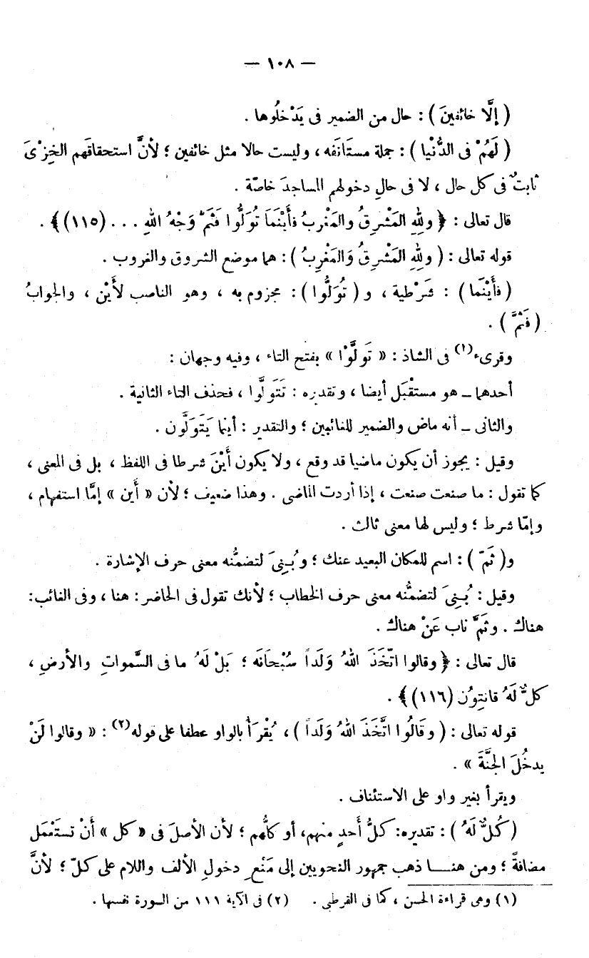(فَأَيْنَمَا) : شَرْطِيَّةٌ، وَ (تُوَلُّوا) : مَجْزُومٌ بِهِ، وَهُوَ النَّاصِبُ لِأَيْنَ، وَالْجَوَابُ (فَثَمَّ) . وَقُرِئَ فِي الشَّاذِّ: تَوَلَّوْا بِفَتْحِ التَّاءِ، وَفِيهِ وَجْهَانِ: أَحَدُهُمَا: هُوَ مُسْتَقْبَلٌ أَيْضًا، وَتَقْدِيرُهُ تَتَوَلَّوْا فَحَذَفَ التَّاءَ الثَّانِيَةَ.