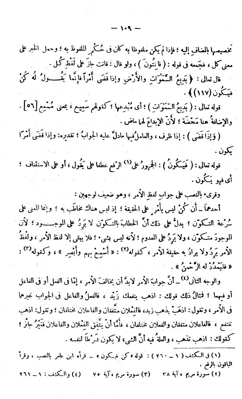 أَحَدُهُمَا: أَنَّ كُنْ لَيْسَ بِأَمْرٍ عَلَى الْحَقِيقَةِ ; إِذْ لَيْسَ هُنَاكَ مُخَاطَبٌ بِهِ، وَإِنَّمَا الْمَعْنَى عَلَى سُرْعَةِ التَّكَوُّنِ ; يَدُلُّ عَلَى ذَلِكَ أَنَّ الْخِطَابَ بِالتَّكَوُّنِ لَا يَرِدُ عَلَى الْمَوْجُودِ ; لِأَنَّ الْمَوْجُودَ مُتَكَوِّنٌ وَلَا يَرِدُ عَلَى الْمَعْدُومِ ; لِأَنَّهُ لَيْسَ بِشَيْءٍ لَا يَبْقَى إِلَّا لَفْظُ الْأَمْرِ، وَلَفْظُ الْأَمْرِ يَرِدُ، وَلَا يُرَادُ بِهِ حَقِيقَةُ الْأَمْرِ كَقَوْلِهِ: (أَسْمِعْ بِهِمْ وَأَبْصِرْ) [مَرْيَمَ: 38] وَكَقَوْلِهِ: (فَلْيَمْدُدْ لَهُ الرَّحْمَنُ) [مَرْيَمَ: 75] .