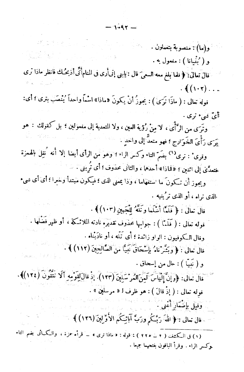 قَوْلُهُ تَعَالَى: (مَاذَا تَرَى) : يَجُوزُ أَنْ يَكُونَ «مَاذَا» اسْمًا وَاحِدًا يُنْصَبُ بِـ «تَرَى» أَيْ: أَيَّ شَيْءٍ تَرَى.