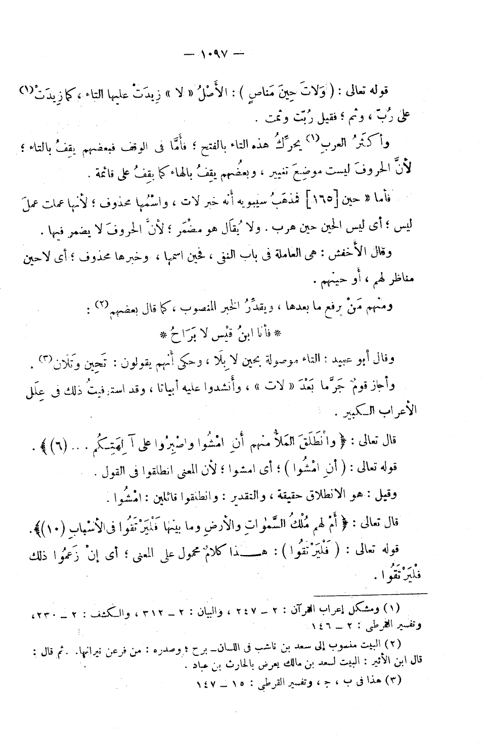 قَوْلُهُ تَعَالَى: (وَلَاتَ حِينَ مَنَاصٍ) : الْأَصْلُ «لَا» زِيدَتْ عَلَيْهَا التَّاءُ، كَمَا زِيدَتْ عَلَى رُبَّ، وَثُمَّ: فَقِيلَ رُبَّتَ وَثُمَّتْ.