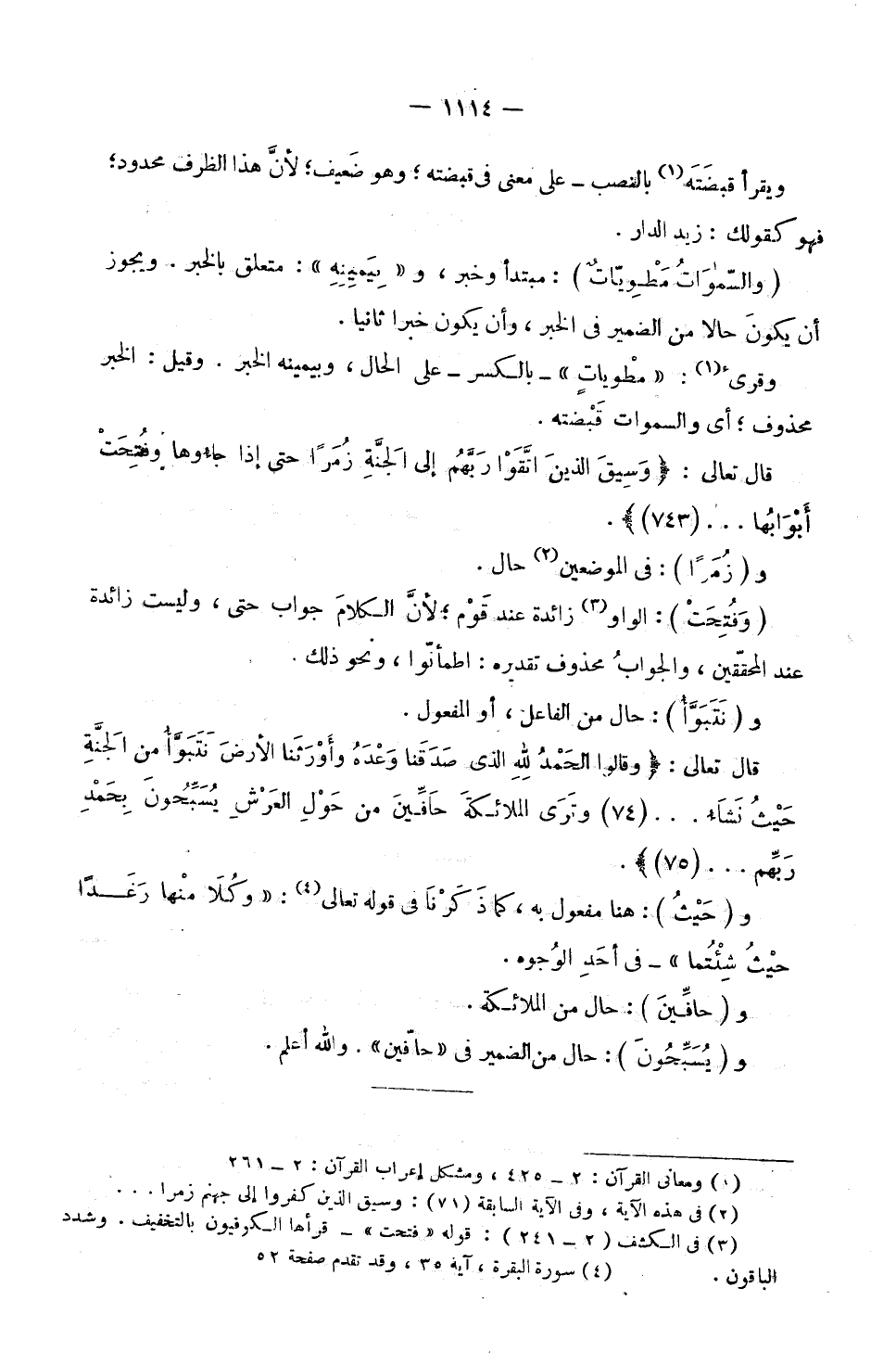 وَ (زُمَرًا) : فِي الْمَوْضِعَيْنِ حَالٌ. (وَفُتِحَتْ) : الْوَاوُ زَائِدَةٌ عِنْدَ قَوْمٍ؛ لِأَنَّ الْكَلَامَ جَوَابُ حَتَّى، وَلَيْسَتْ زَائِدَةً عِنْدَ الْمُحَقِّقِينَ، وَالْجَوَابُ مَحْذُوفٌ تَقْدِيرُهُ: اطْمَأَنُّوا، وَنَحْوَ ذَلِكَ. وَ (نَتَبَوَّأُ) : حَالٌ مِنَ الْفَاعِلِ، أَوِ الْمَفْعُولِ.