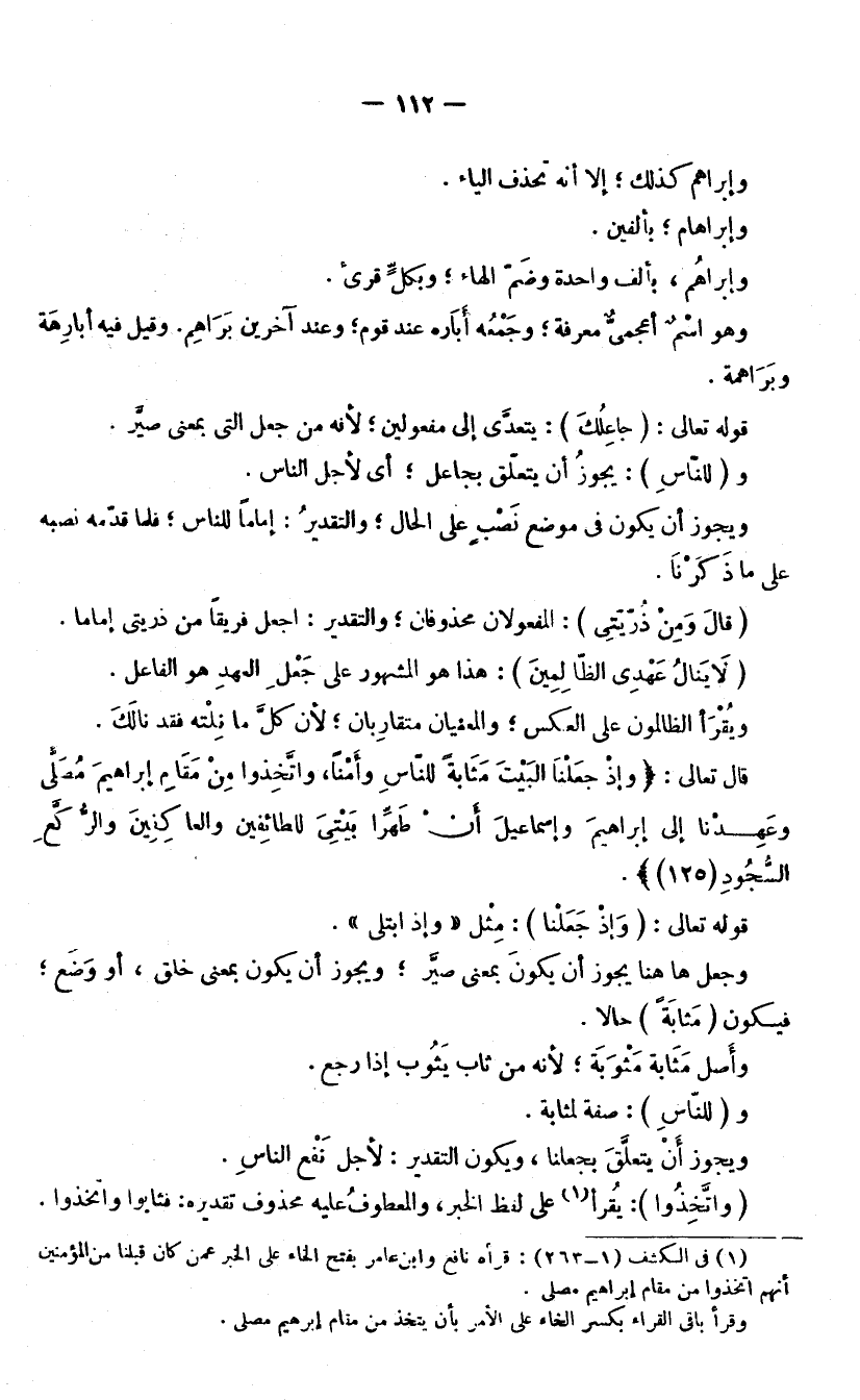 وَيَجُوزُ أَنْ يَكُونَ فِي مَوْضِعِ نَصْبٍ عَلَى الْحَالِ ; وَالتَّقْدِيرُ: إِمَامًا لِلنَّاسِ ; فَلَمَّا قَدَّمَهُ نَصَبَهُ عَلَى مَا ذَكَرْنَا. (قَالَ وَمِنْ ذُرِّيَّتِي) : الْمَفْعُولَانِ مَحْذُوفَانِ، وَالتَّقْدِيرُ: اجْعَلْ فَرِيقًا مِنْ ذُرِّيَّتِي إِمَامًا. (لَا يَنَالُ عَهْدِي الظَّالِمِينَ) : هَذَا هُوَ الْمَشْهُورُ عَلَى جَعْلِ الْعَهْدِ هُوَ الْفَاعِلُ. وَيُقْرَأُ الظَّالِمُونَ عَلَى الْعَكْسِ ; وَالْمَعْنَيَانِ مُتَقَارِبَانِ لِأَنَّ مَا نِلْتَهُ فَقَدْ نَالَكَ.