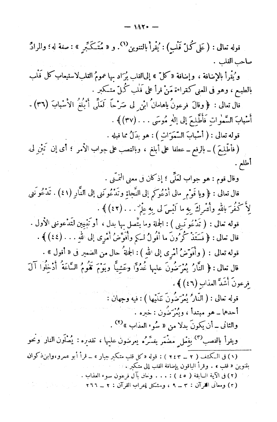 قَوْلُهُ تَعَالَى: (عَلَى كُلِّ قَلْبِ) : يُقْرَأُ بِالتَّنْوِينِ. وَ (مُتَكَبِّرٍ) : صِفَةٌ لَهُ؛ وَالْمُرَادُ صَاحِبُ الْقَلْبِ. وَيُقْرَأُ بِالْإِضَافَةِ، وَإِضَافَةُ «كُلِّ» إِلَى الْقَلْبِ يُرَادُ بِهَا عُمُومُ الْقَلْبِ لِاسْتِيعَابِ كُلِّ قَلْبٍ بِالطَّبْعِ، وَهُوَ فِي الْمَعْنَى كَقِرَاءَةِ مَنْ قَرَأَ: عَلَى قَلْبِ كُلِّ مُتَكَبِّرٍ.