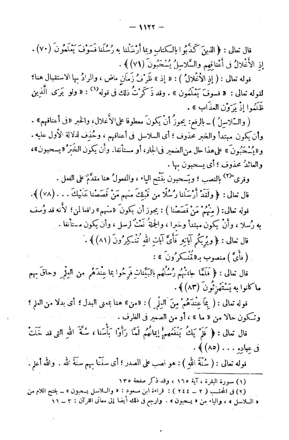 وَ (السَّلَاسِلُ) - بِالرَّفْعِ: يَجُوزُ أَنْ يَكُونَ مَعْطُوفًا عَلَى الْأَغْلَالِ، وَالْخَبَرُ: «فِي أَعْنَاقِهِمْ» وَأَنْ يَكُونَ مُبْتَدَأً وَالْخَبَرُ مَحْذُوفٌ؛ أَيِ السَّلَاسِلُ فِي أَعْنَاقِهِمْ، وَحُذِفَ لِدَلَالَةِ الْأَوَّلِ عَلَيْهِ. وَ «يُسْحَبُونَ» عَلَى هَذَا: حَالٌ مِنَ الضَّمِيرِ فِي الْجَارِّ، أَوْ مُسْتَأْنَفًا. وَأَنْ يَكُونَ الْخَبَرُ «يُسْحَبُونَ» وَالْعَائِدُ مَحْذُوفٌ؛ أَيْ يُسْحَبُونَ بِهَا.