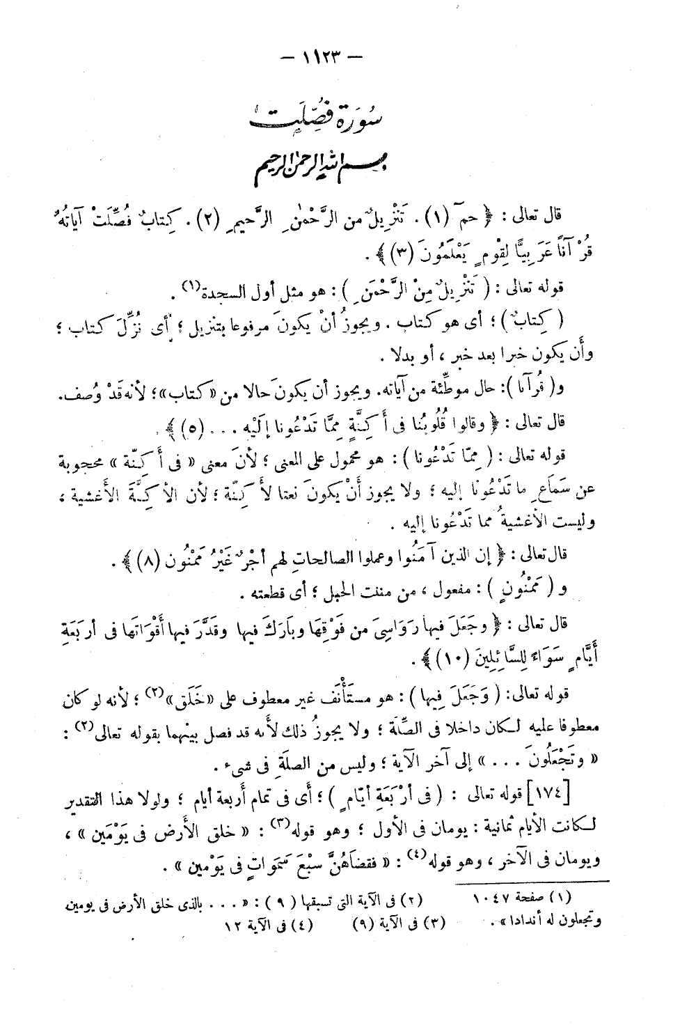 قَوْلُهُ تَعَالَى: (تَنْزِيلٌ مِنَ الرَّحْمَنِ) : هُوَ مِثْلُ أَوَّلِ السَّجْدَةِ. كِتَابٌ؛ أَيْ هُوَ كِتَابٌ. وَيَجُوزُ أَنْ يَكُونَ مَرْفُوعًا بِتَنْزِيلٍ؛ أَيْ نُزِّلَ كِتَابٌ؛ وَأَنْ يَكُونَ خَبَرًا بَعْدَ خَبَرٍ، أَوْ بَدَلًا. وَ (قُرْآنًا) : حَالٌ مُوَطِّئَةٌ مِنْ «آيَاتِهِ» . وَيَجُوزُ أَنْ يَكُونَ حَالًا مِنْ «كِتَابٍ» لِأَنَّهُ قَدْ وُصِفَ.