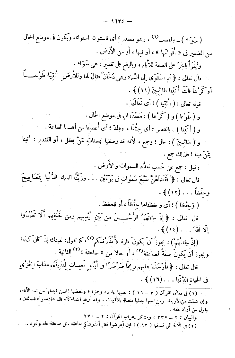 (سَوَاءً) - بِالنَّصْبِ، وَهُوَ مَصْدَرٌ؛ أَيْ فَاسْتَوَتِ اسْتِوَاءً، وَيَكُونُ فِي مَوْضِعِ الْحَالِ مِنَ الضَّمِيرِ فِي «أَقْوَاتِهَا» ، أَوْ فِيهَا، أَوْ مِنَ الْأَرْضِ. وَيُقْرَأُ بِالْجَرِّ عَلَى الصِّفَةِ لِلْأَيَّامِ، وَبِالرَّفْعِ عَلَى تَقْدِيرِ هِيَ سَوَاءٌ.