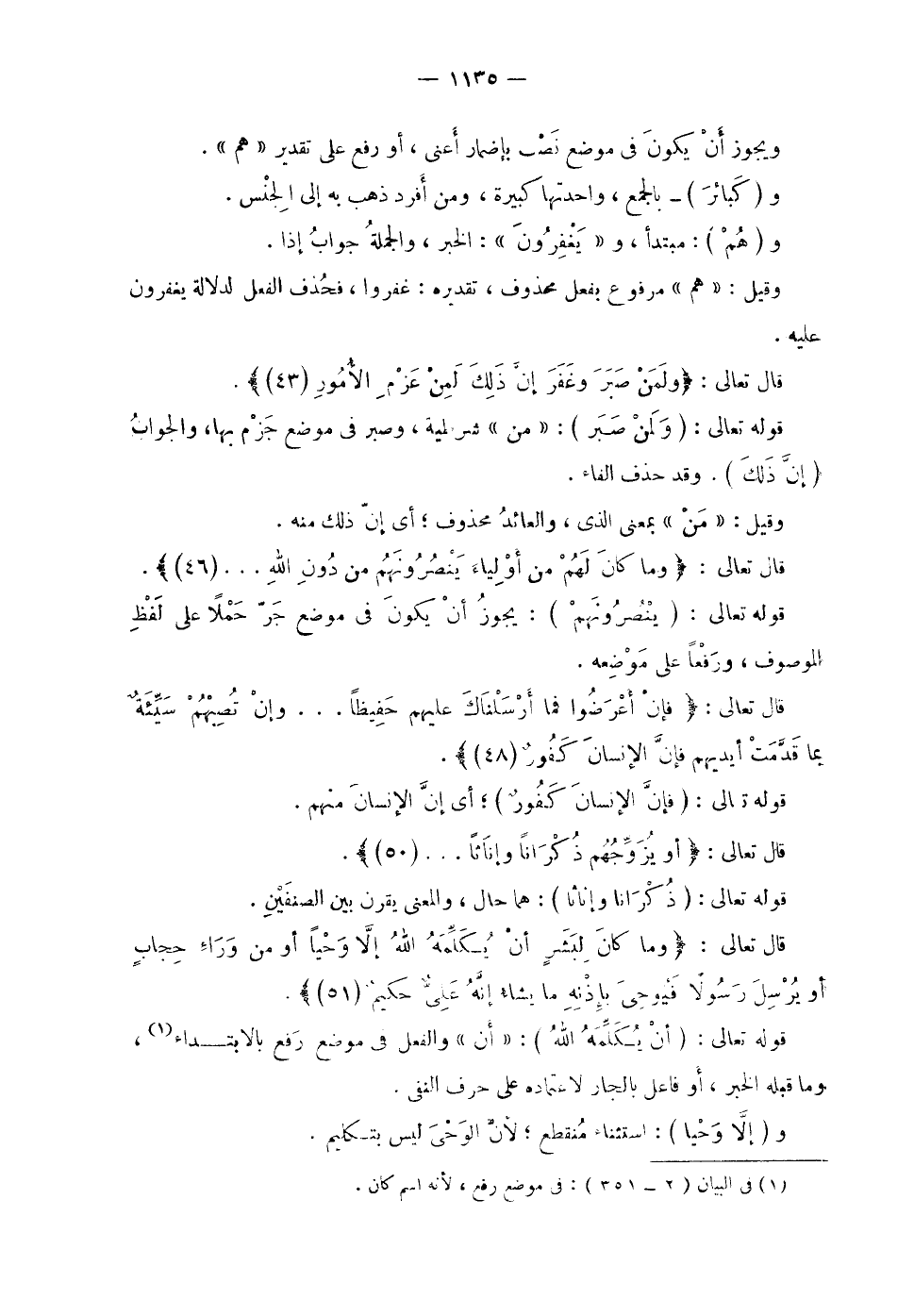 قَوْلُهُ تَعَالَى: (أَنْ يُكَلِّمَهُ اللَّهُ) : «أَنْ» وَالْفِعْلُ فِي مَوْضِعِ رَفْعٍ بِالِابْتِدَاءِ، وَمَا قَبْلَهُ الْخَبَرُ، أَوْ فَاعِلٌ بِالْجَارِّ لِاعْتِمَادِهِ عَلَى حَرْفِ النَّفْيِ وَ (إِلَّا وَحْيًا) : اسْتِثْنَاءٌ مُنْقَطِعٌ؛ لِأَنَّ الْوَحْيَ لَيْسَ بِتَكْلِيمٍ.