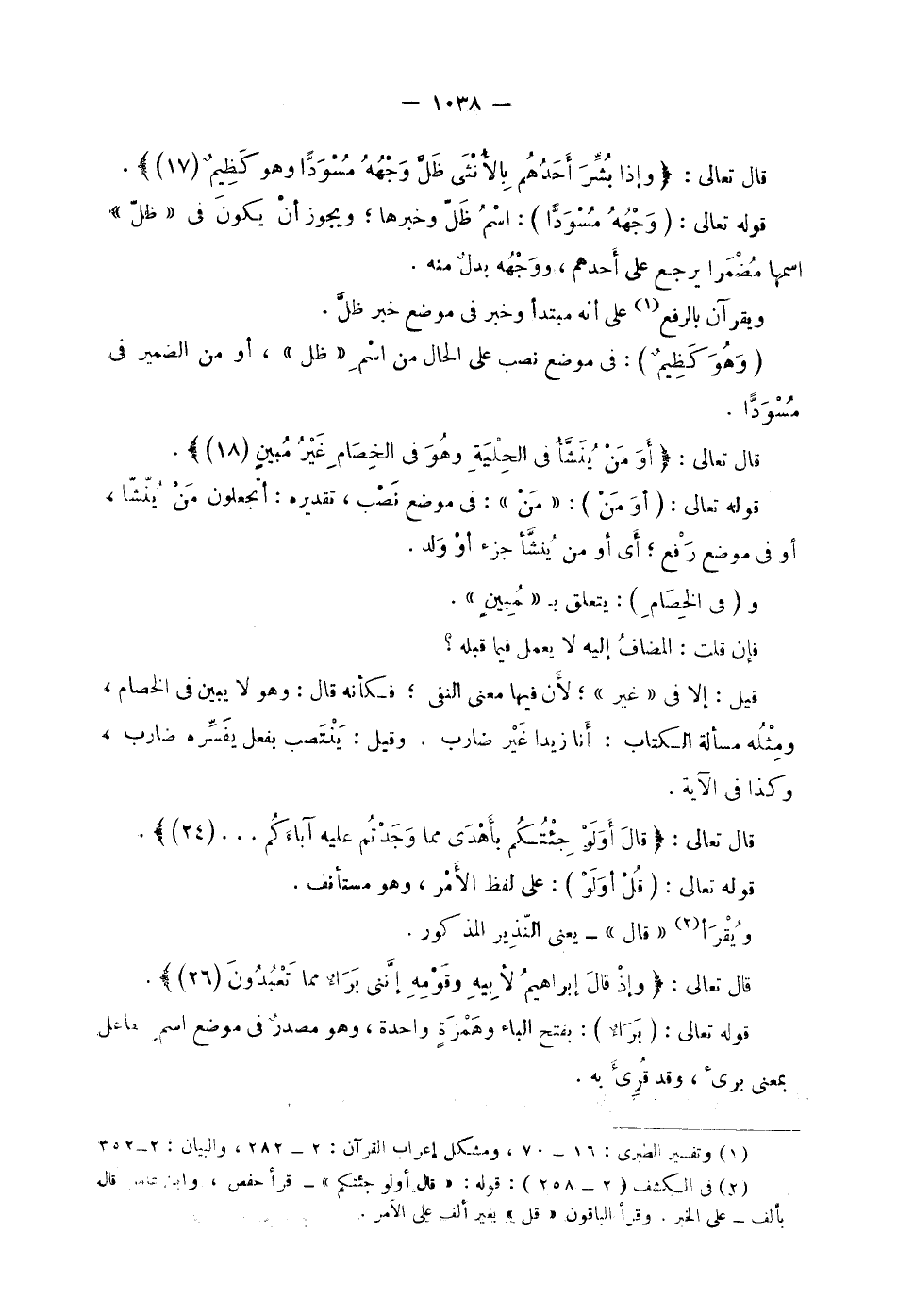 قَوْلُهُ تَعَالَى: (أَوَمَنْ) : «مَنْ» فِي مَوْضِعِ نَصْبٍ، تَقْدِيرُهُ: أَتَجْعَلُونَ مَنْ يُنَشَّأُ، أَوْ فِي مَوْضِعِ رَفْعٍ؛ أَيْ أَوَمَنْ يُنَشَّأُ جُزْءٌ أَوْ وَلَدٌ. وَ (فِي الْخِصَامِ) : يَتَعَلَّقُ بِـ «مُبِينٍ» . فَإِنْ قُلْتَ: الْمُضَافُ إِلَيْهِ لَا يَعْمَلُ فِيمَا قَبْلَهُ؟ .