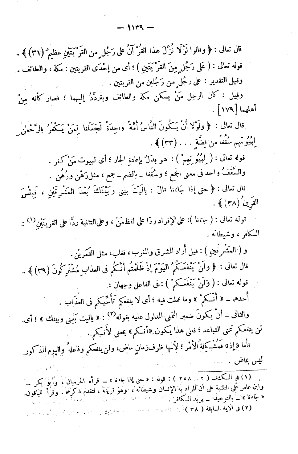 قَوْلُهُ تَعَالَى: (عَلَى رَجُلٍ مِنَ الْقَرْيَتَيْنِ) أَيْ مِنْ إِحْدَى الْقَرْيَتَيْنِ: مَكَّةُ، وَالطَّائِفُ. وَقِيلَ: التَّقْدِيرُ: عَلَى رَجُلٍ مِنْ رَجُلَيْنِ مِنَ الْقَرْيَتَيْنِ.