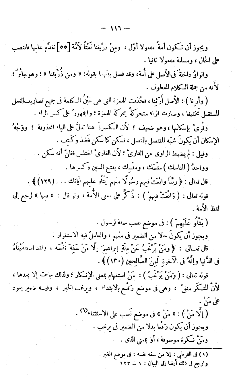 وَيَجُوزُ أَنْ تَكُونَ «أُمَّةً» مَفْعُولًا أَوَّلَ، «وَمِنْ ذُرِّيَّتِنَا» نَعْتًا لِأُمَّةٍ تَقَدَّمَ عَلَيْهَا فَانْتَصَبَ عَلَى الْحَالِ، وَمُسْلِمَةً مَفْعُولًا ثَانِيًا، وَالْوَاوُ دَاخِلَةٌ فِي الْأَصْلِ عَلَى أُمَّةٍ، وَقَدْ فَصَلَ بَيْنَهُمَا بِقَوْلِهِ (وَمِنْ ذُرِّيَّتِنَا) : وَهُوَ جَائِزٌ ; لِأَنَّهُ مِنْ جُمْلَةِ الْكَلَامِ الْمَعْطُوفِ. (وَأَرِنَا) : الْأَصْلُ أَرْئِنَا ; فَحُذِفَتِ الْهَمْزَةُ الَّتِي هِيَ عَيْنُ الْكَلِمَةِ فِي جَمِيعِ تَصَارِيفِ الْفِعْلِ الْمُسْتَقْبَلِ تَخْفِيفًا وَصَارَتِ الرَّاءُ مُتَحَرِّكَةً بِحَرَكَةِ الْهَمْزَةِ وَالْجُمْهُورُ عَلَى كَسْرِ الرَّاءِ وَقُرِئَ بِإِسْكَانِهَا وَهُوَ ضَعِيفٌ لِأَنَّ الْكَسْرَةَ هُنَا تَدُلُّ عَلَى الْيَاءِ الْمَحْذُوفَةِ وَوَجْهُ الْإِسْكَانِ أَنْ يَكُونَ شَبَّهَ الْمُنْفَصِلَ بِالْمُتَّصِلِ فَسَكَنَ كَمَا سَكَنَ فَخِذٌ وَكَتِفٌ وَقِيلَ لَمْ يَضْبُطِ الرَّاوِي عَنِ الْقَارِئِ لِأَنَّ الْقَارِئَ اخْتَلَسَ فَظَنَّ أَنَّهُ سَكَّنَ وَوَاحِدُ الْمَنَاسِكِ مَنْسَكٌ وَمَنْسَكٌ بِفَتْحِ السِّينِ وَكَسْرِهَا.