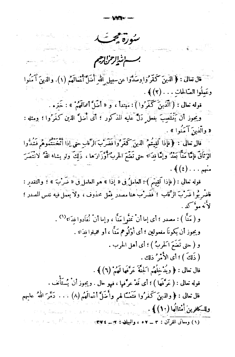 قَوْلُهُ تَعَالَى: (فَإِذا لَقِيتُمُ) : الْعَامِلُ فِي «إِذَا» هُوَ الْعَامِلُ فِي «ضَرْبَ» وَالتَّقْدِيرُ: فَاضْرِبُوا ضَرْبَ الرِّقَابِ؛ فَضَرْبٌ هُنَا مَصْدَرُ فِعْلٍ مَحْذُوفٍ؛ وَلَا يَعْمَلُ فِيهِ نَفْسُ الْمَصْدَرِ؛ لِأَنَّهُ مُؤَكَّدٌ. وَ (مَنًّا) : مَصْدَرٌ؛ أَيْ إِمَّا أَنْ تَمُنُّوا مَنًّا، وَإِمَّا أَنْ تُفَادُوا فِدَاءً.