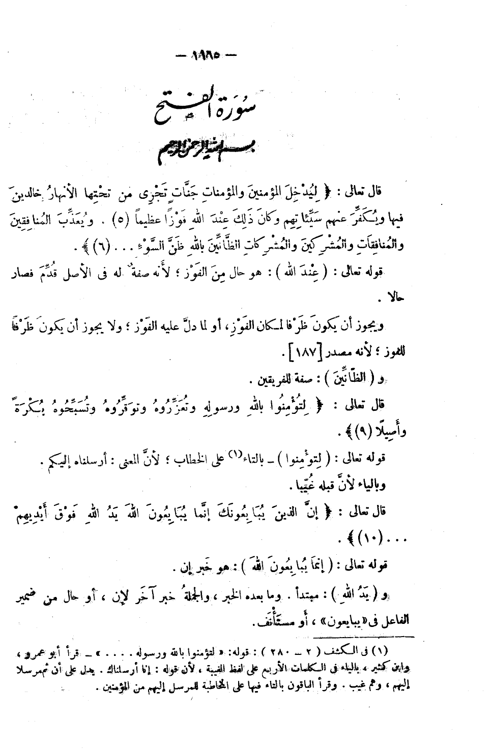 قَوْلُهُ تَعَالَى: (إِنَّمَا يُبَايِعُونَ اللَّهَ) : هُوَ خَبَرُ إِنَّ. وَ (يَدُ اللَّهِ) : مُبْتَدَأٌ. وَمَا بَعْدَهُ الْخَبَرُ، وَالْجُمْلَةُ خَبَرٌ آخَرُ لَإِنَّ، أَوْ حَالٌ مِنْ ضَمِيرِ الْفَاعِلِ فِي «يُبَايِعُونَ» أَوْ مُسْتَأْنَفٌ.