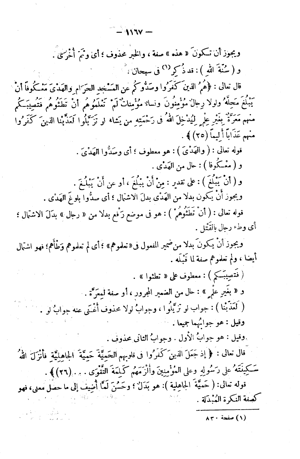 قَوْلُهُ تَعَالَى: (وَالْهَدْيَ) : هُوَ مَعْطُوفٌ؛ أَيْ وَصَدُّوا الْهَدْيَ. وَ (مَعْكُوفًا) : حَالٌ مِنَ الْهَدْيِ. وَ (أَنْ يَبْلُغَ) : عَلَى تَقْدِيرِ: مِنْ أَنْ يَبْلُغَ، أَوْ عَنْ أَنْ يَبْلُغَ.